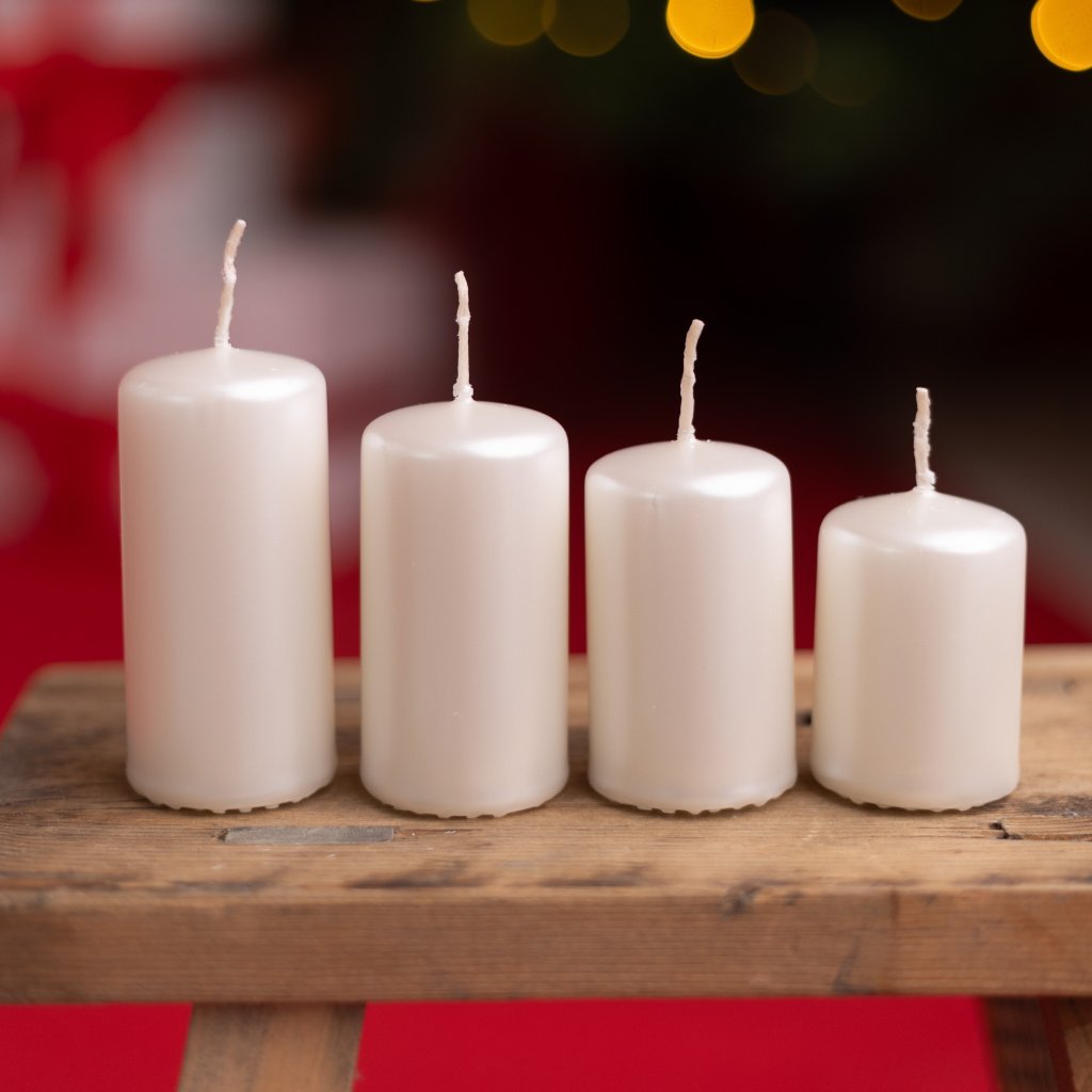 Adventné sviečky postupné 4ks BIELE PERLEŤOVÉ od 8,5cm