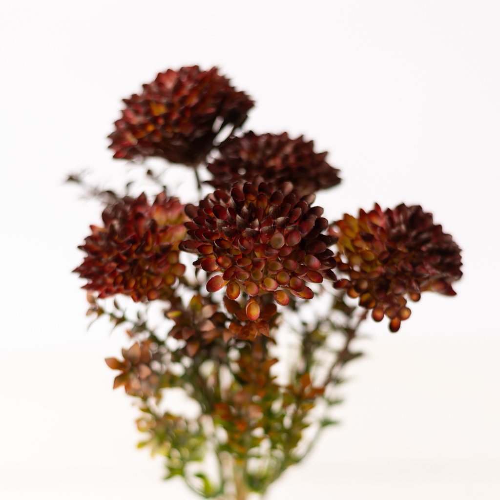 Dekoratívna plastová dália v hnedo-bordových tónoch predstavuje dokonalú kombináciu elegancie a trvácnosti. Kvet je detailne prepracovaný – jednotlivé lupienky pôsobia prirodzene, majú jemné farebné prechody a realistickú štruktúru. Vďaka kvalitnému materiálu si zachováva svoj tvar aj farbu po dlhý čas.