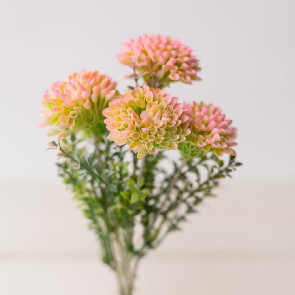 Dekoratívna plastová dália v ružovo-zelených tónoch predstavuje dokonalú kombináciu elegancie a trvácnosti. Kvet je detailne prepracovaný – jednotlivé lupienky pôsobia prirodzene, majú jemné farebné prechody a realistickú štruktúru. Vďaka kvalitnému materiálu si zachováva svoj tvar aj farbu po dlhý čas.