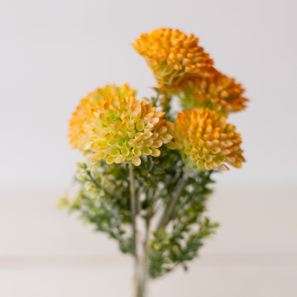 Dekoratívna plastová dália v žlto-oranžových tónoch predstavuje dokonalú kombináciu elegancie a trvácnosti. Kvet je detailne prepracovaný – jednotlivé lupienky pôsobia prirodzene, majú jemné farebné prechody a realistickú štruktúru. Vďaka kvalitnému materiálu si zachováva svoj tvar aj farbu po dlhý čas.