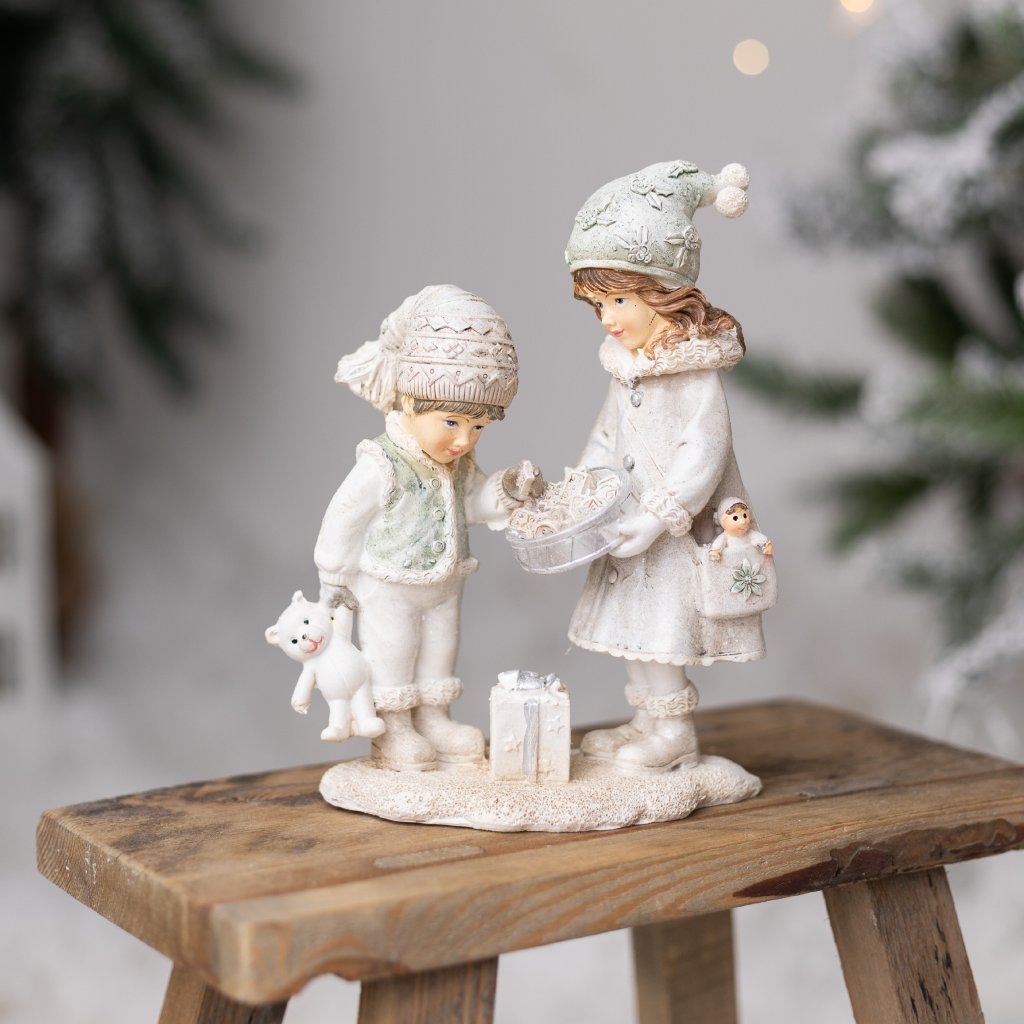 Vianočná postavička Deti s parníčkami a balíkom 19cm. Polyresin.