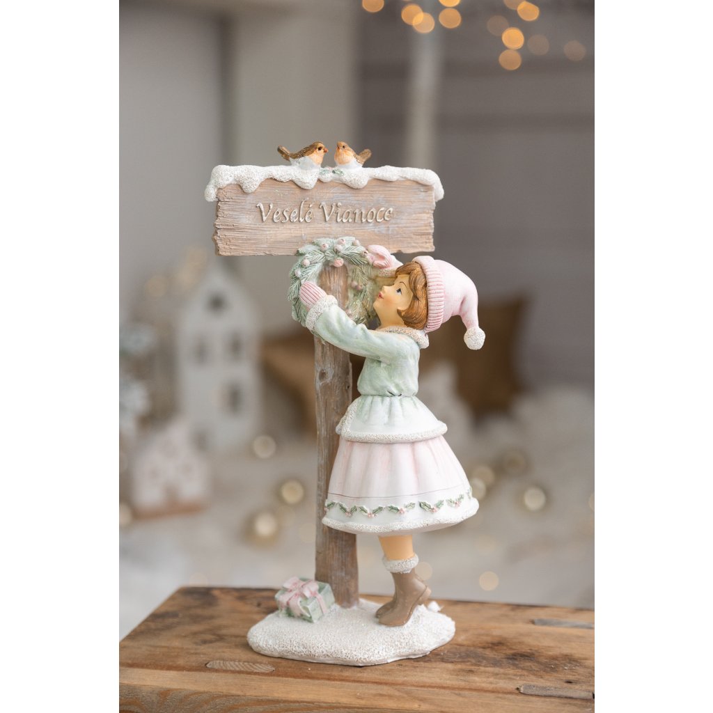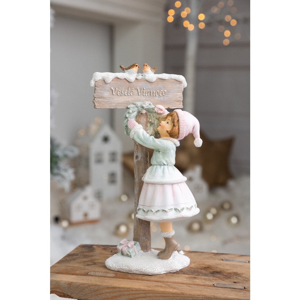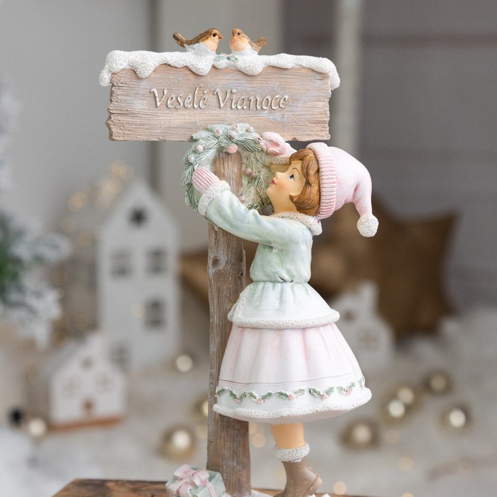 Vianočná postavička Dievča s nápisom Veselé Vianoce 24x13cm. Ružová farba. Polyresin.