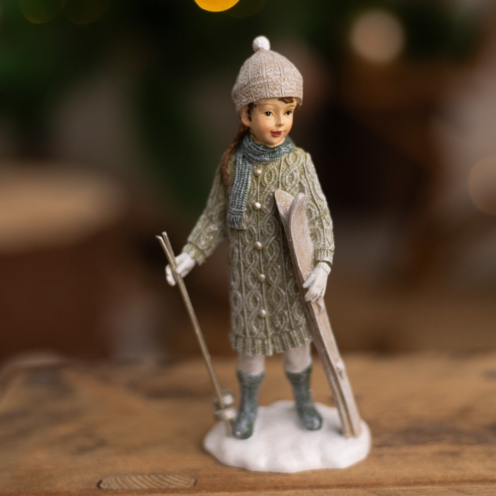 Vianočná postavička Dievčatko s lyžami 14x6cm. Polyresin.