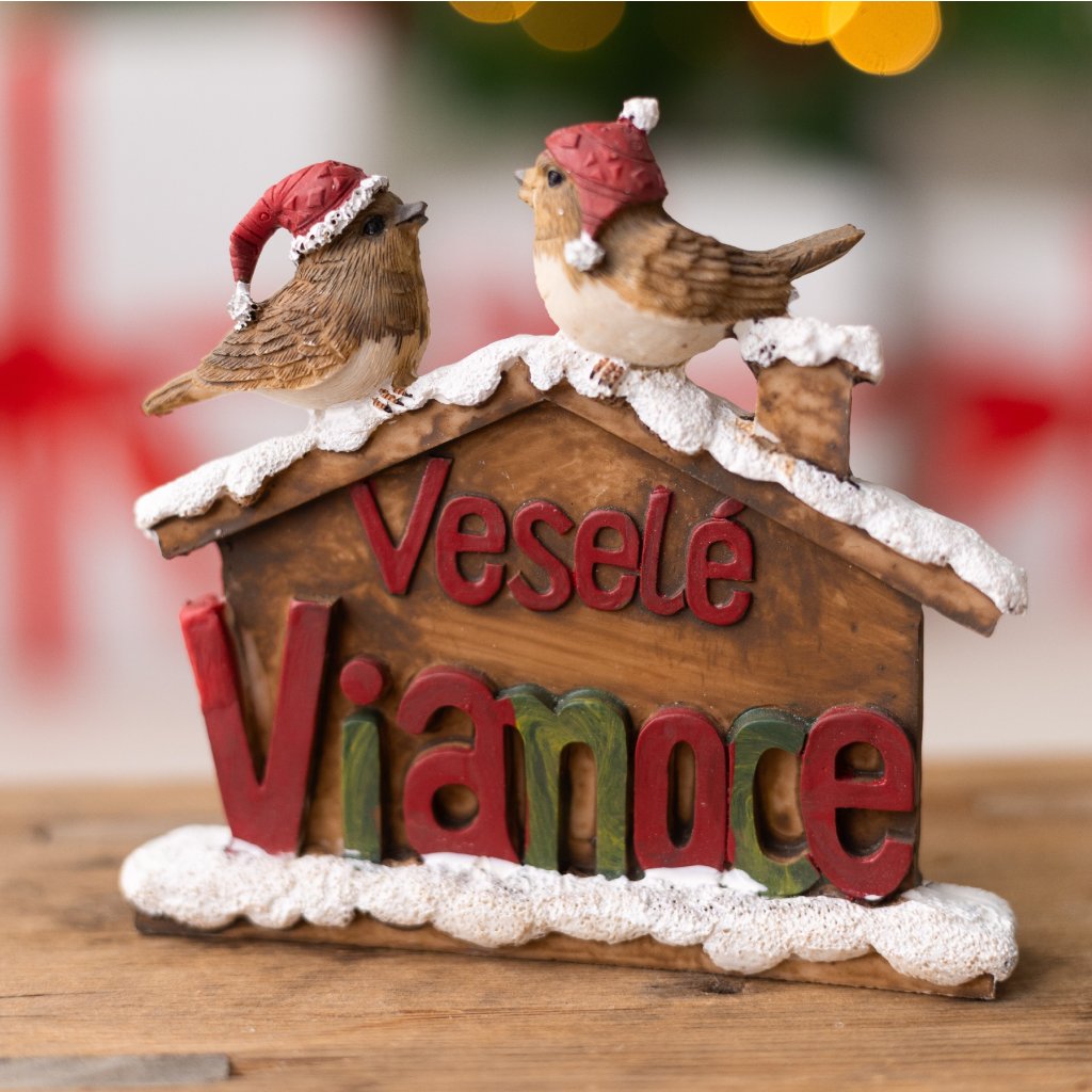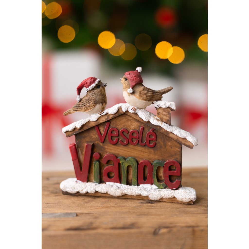 Domček s vtáčikmi a nápisom Veselé Vianoce 12x12cm. Červená farba. Polyresin.
