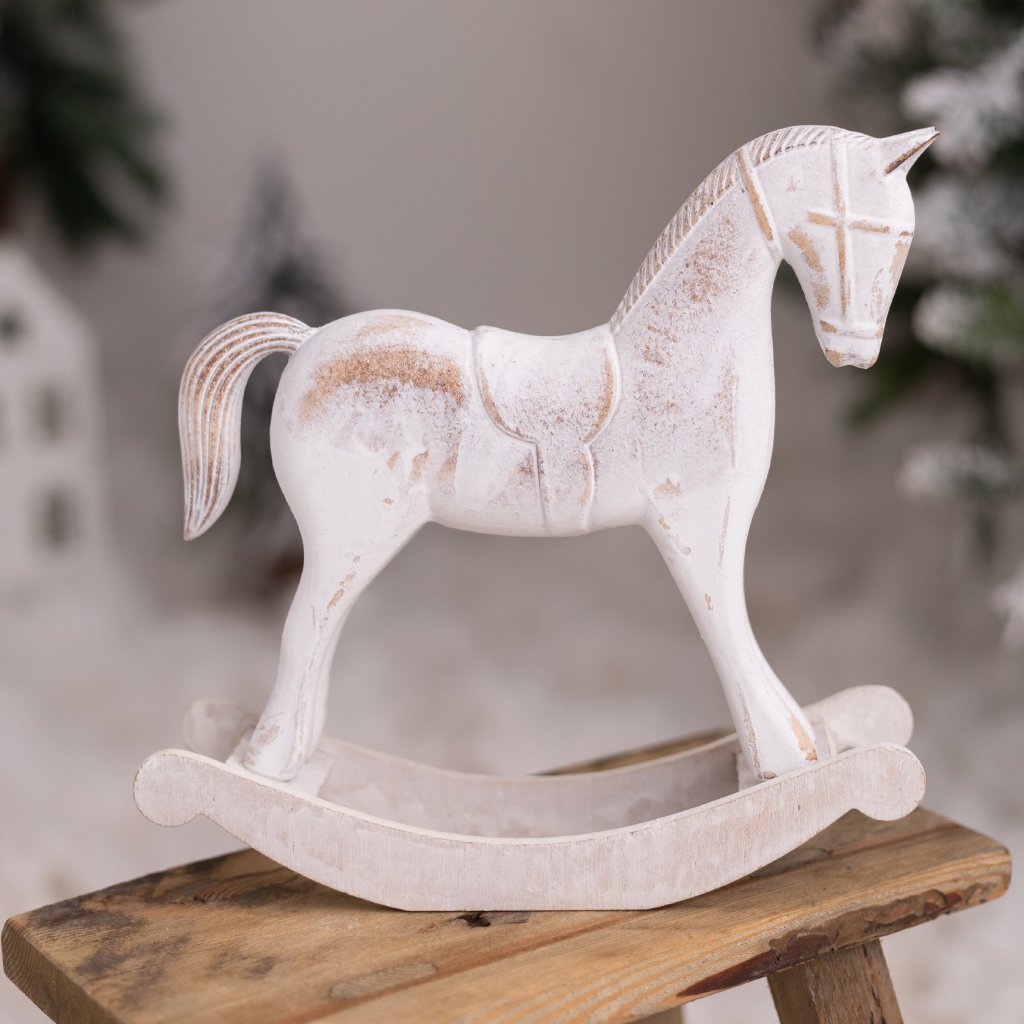 Nádherne vypracovaný, kvalitný, drevený hojdací koník v bielej prírodnej farbe. Vhodný do dekorácií a aj na poličku.