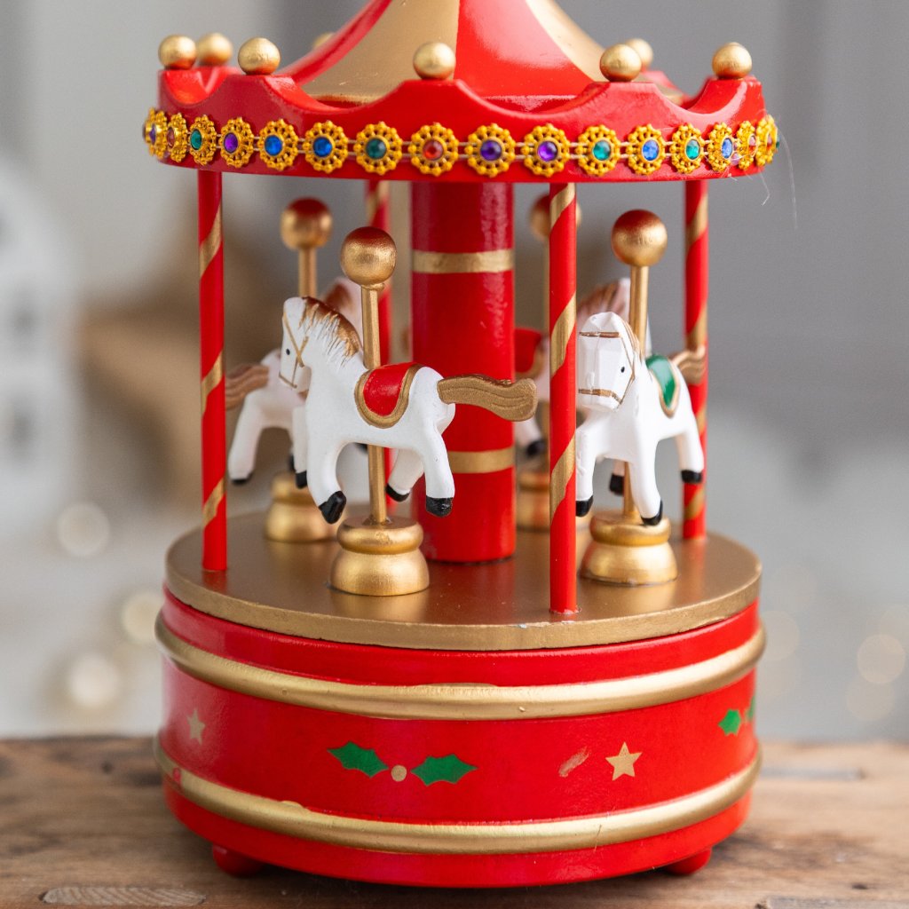 Drevený točiaci sa kolotoč s vianočnou melódiou. Výška kolotoču je 24cm. Natáčanie na kľúčik.