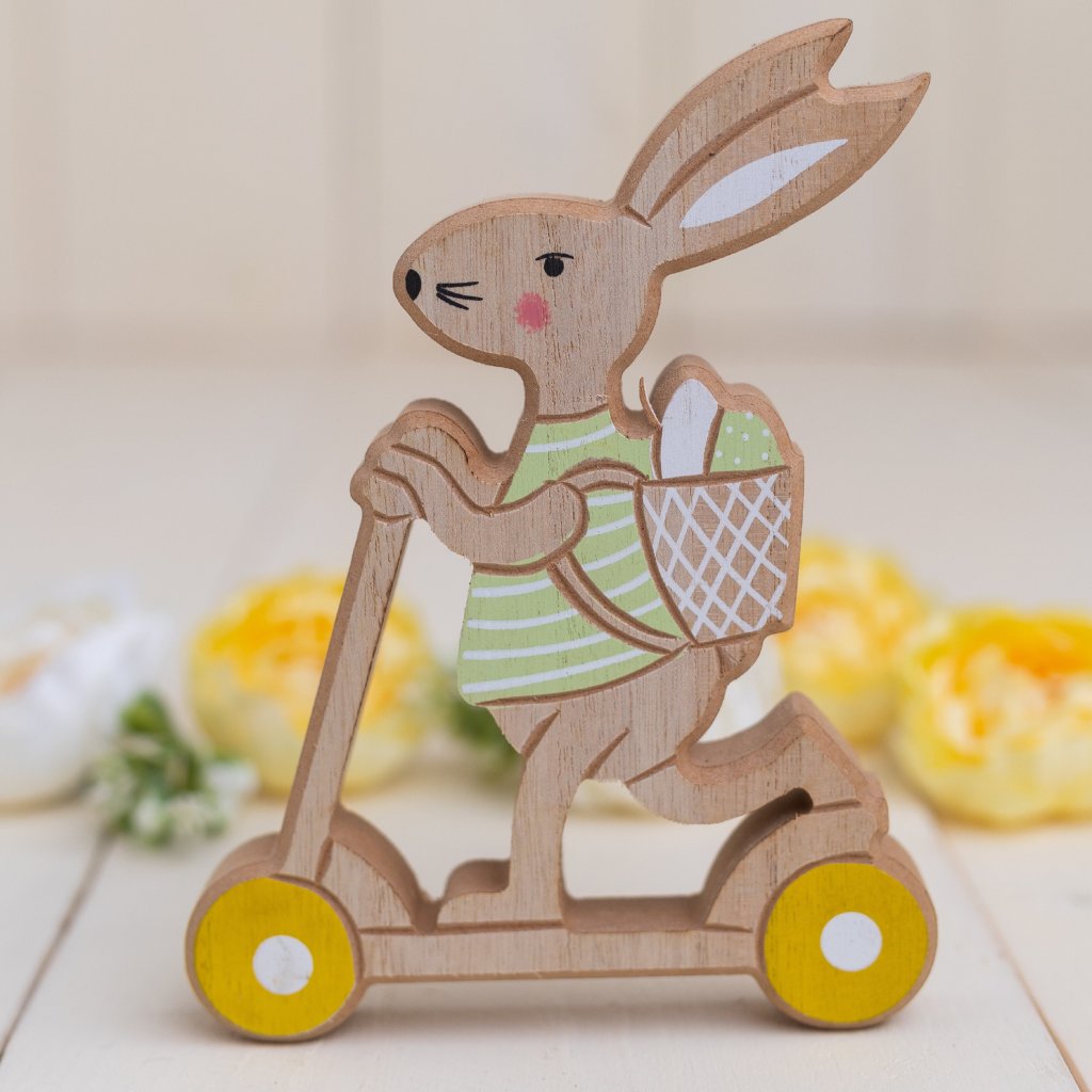 Drevený zajac na kolobežke 13,5 x 5 x 18cm, krásne kvalitné vyhotovenie. Je ku nemu aj zajačica :)