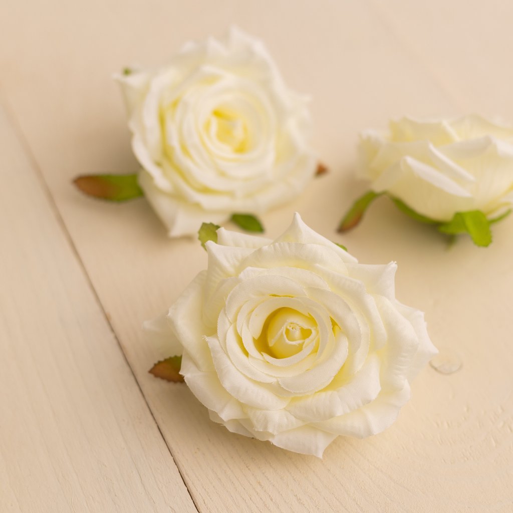 Hlavička ruže s jemnými látkovými lupeňmi a zelenými lístočkami IVORY 9cm.