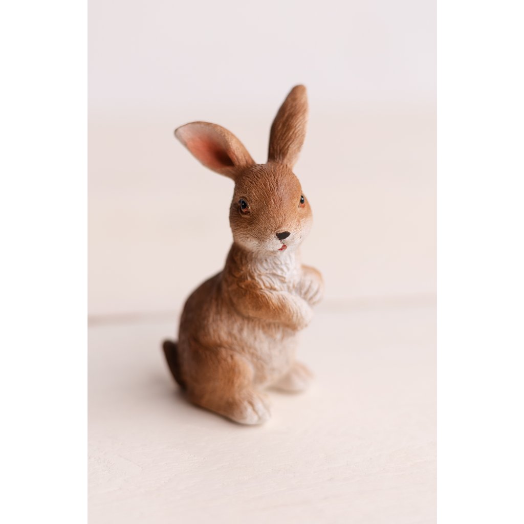 Figúrka je vyrobená z kvalitného polyresinu, ktorý zaručuje pevnosť, odolnosť a dlhú životnosť. Prírodné hnedé odtiene v kombinácii so svetlejšími detailmi pôsobia realisticky a zároveň elegantne, vďaka čomu sa zajačik hodí do rôznych štýlov interiéru.