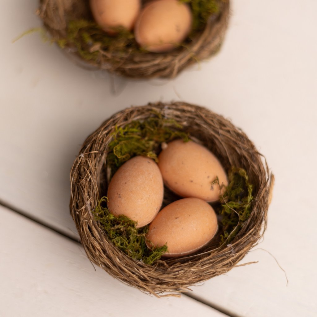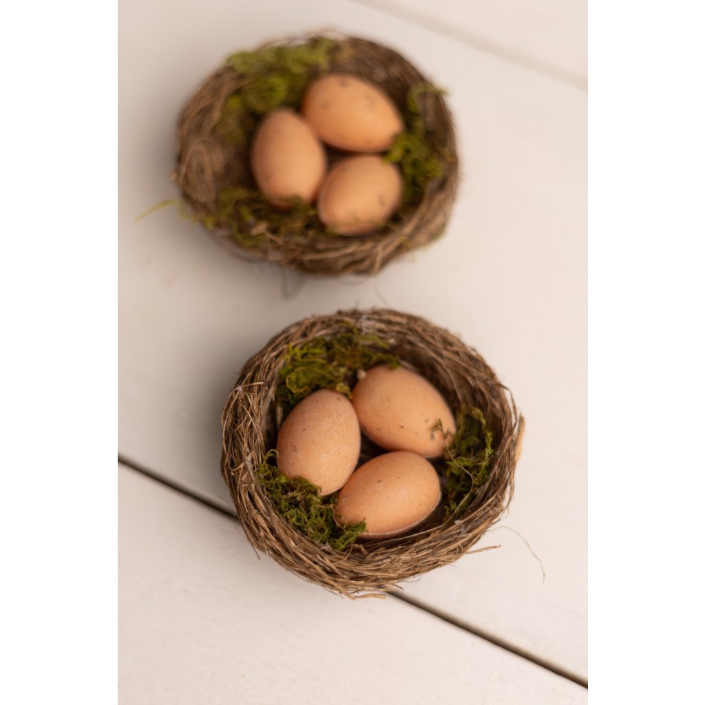 Hniezdo s 3 vajíčkami je ideálnou dekoráciou na Veľkú noc. Prírodné farby a materiály dodávajú tomuto produktu autentický vzhľad. Hniezdo je vyrobené z prírodných vlákien a je doplnené o mach. Rozmery hniezda sú 9 cm, čo ho robí skvelým doplnkom do vašich jarných dekorácií. Hniezda majú autentický rustikálny vzhľad a sú vhodné na aranžovanie veľkonočných dekorácií, jarných vencov, stolových ozdôb či floristických kompozícií. Vyniknú v kombinácii s vajíčkami, sušenými kvetmi alebo drobnými dekoráciami. Vďaka prírodnému materiálu pôsobia harmonicky a hodia sa do interiéru aj na kryté exteriérové použitie.