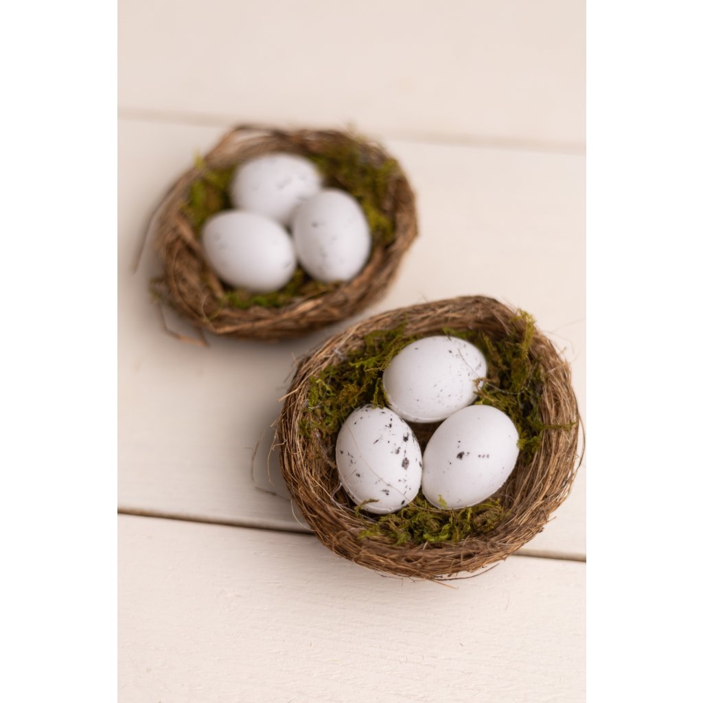 Hniezdo s 3 vajíčkami je ideálnou dekoráciou na Veľkú noc. Prírodné farby a materiály dodávajú tomuto produktu autentický vzhľad. Hniezdo je vyrobené z prírodných vlákien a je doplnené o mach. Rozmery hniezda sú 11 cm, čo ho robí skvelým doplnkom do vašich jarných dekorácií. Hniezda majú autentický rustikálny vzhľad a sú vhodné na aranžovanie veľkonočných dekorácií, jarných vencov, stolových ozdôb či floristických kompozícií. Vyniknú v kombinácii s vajíčkami, sušenými kvetmi alebo drobnými dekoráciami. Vďaka prírodnému materiálu pôsobia harmonicky a hodia sa do interiéru aj na kryté exteriérové použitie.
