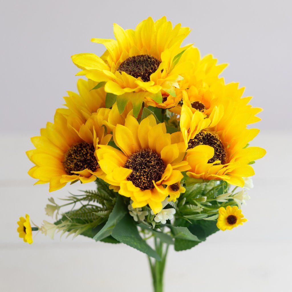 TMAVO ŽLTÁ kytica Slnečnica 45cm, 11 stopiek a hlavičiek s výrazným stredom s realistickými chĺpkami. Priemer hlavičky je 8cm.