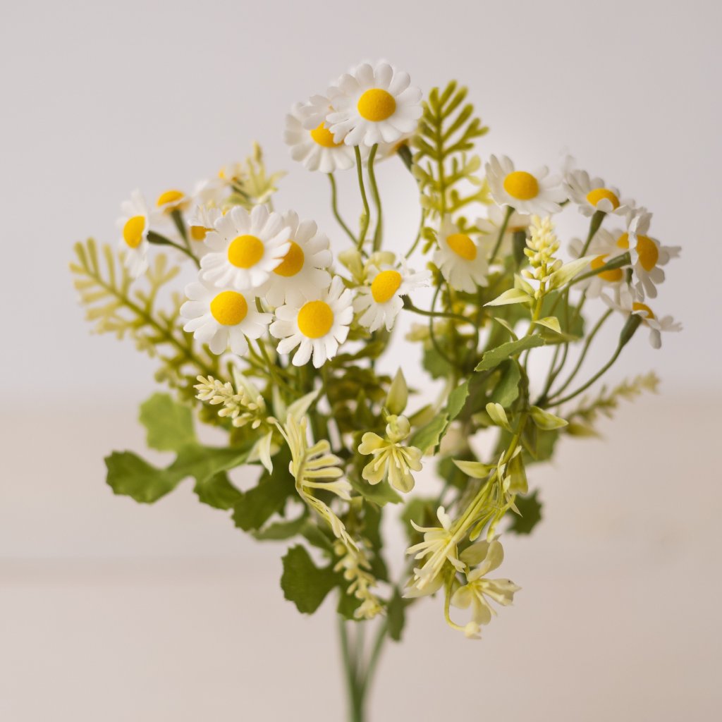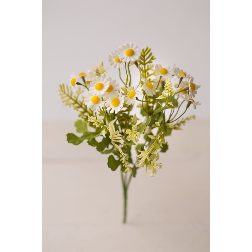 Kytička kamilky s mini kvietkami. Umelá kytička s jemnými kvietkami je ideálnou voľbou pre celoročné dekorovanie. Kytička má výšku približne 35 cm a pozostáva z 5 bohato rozvetvených stopiek, ktoré vytvárajú prirodzený a vzdušný vzhľad. Vďaka kvalitnému spracovaniu je vhodná na rôzne aranžmány – do váz, kvetinových dekorácií, venčekov, stolových ozdôb či sezónnych výzdob. Je ideálna do domácností, kancelárií, prevádzok aj na slávnostné príležitosti. Umelá kvetinka si zachováva svoj vzhľad počas celého roka a nevyžaduje polievanie ani špeciálnu údržbu.