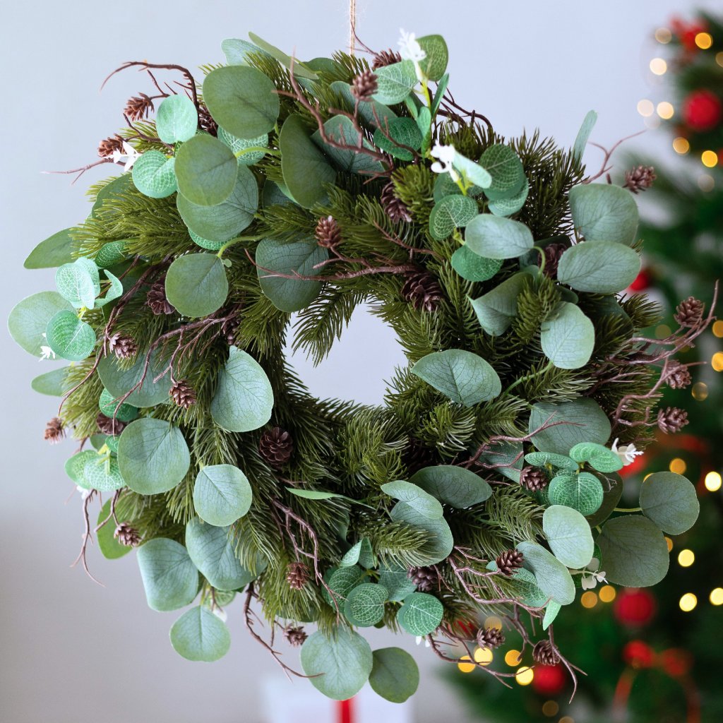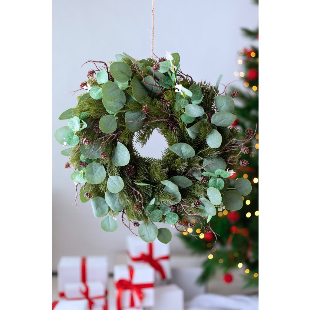 EXTRA hustý veniec 3D čečina, konáriky so šiškami a eukalyptus 53cm. Kvalitné prevedenie.