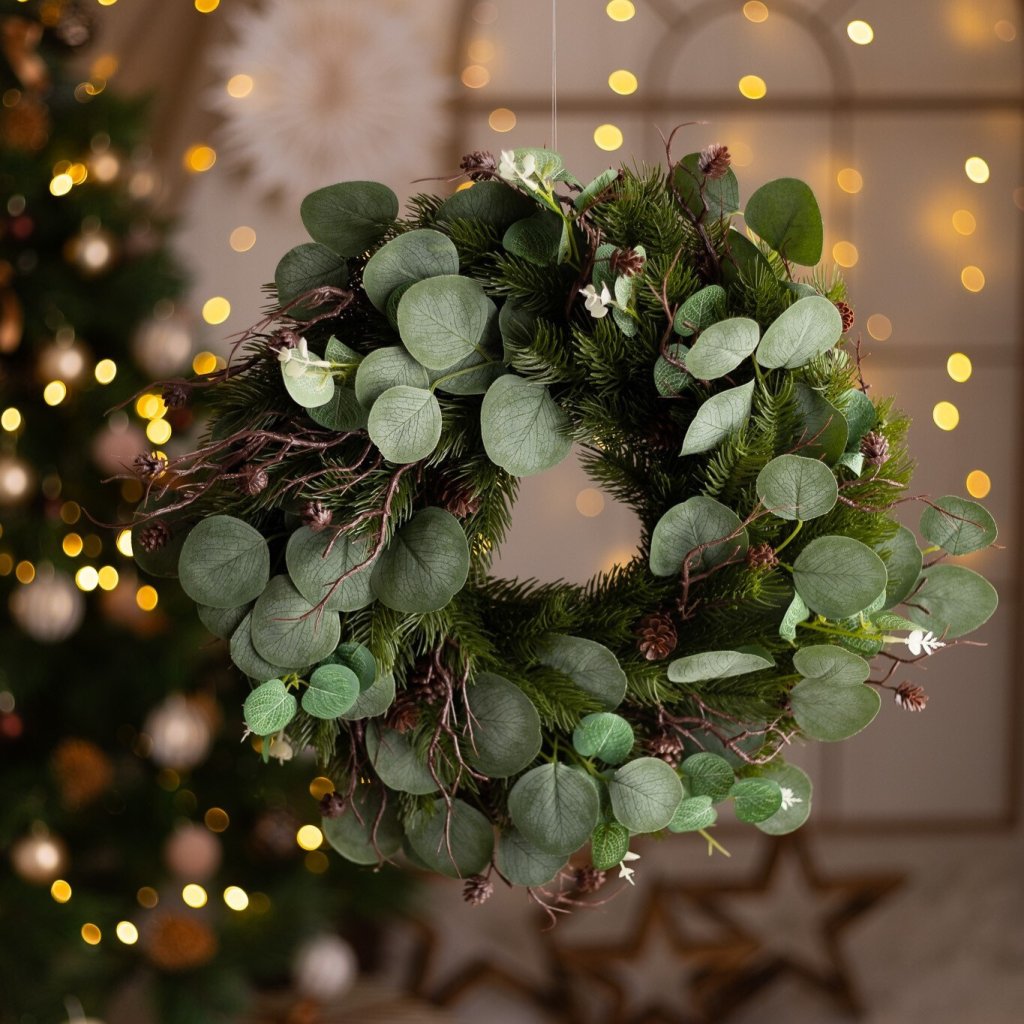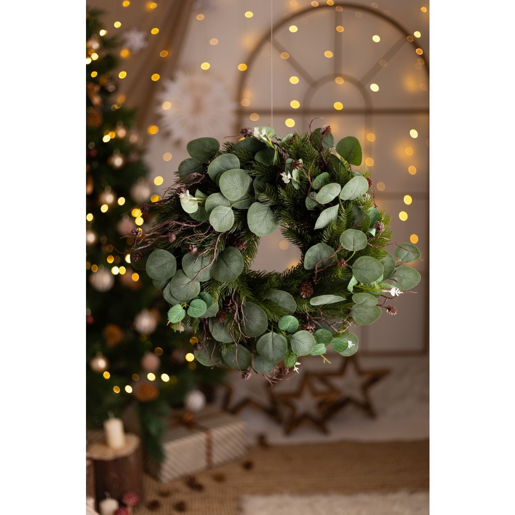 EXTRA hustý veniec 3D čečina, konáriky so šiškami a eukalyptus 53cm. Kvalitné prevedenie.
