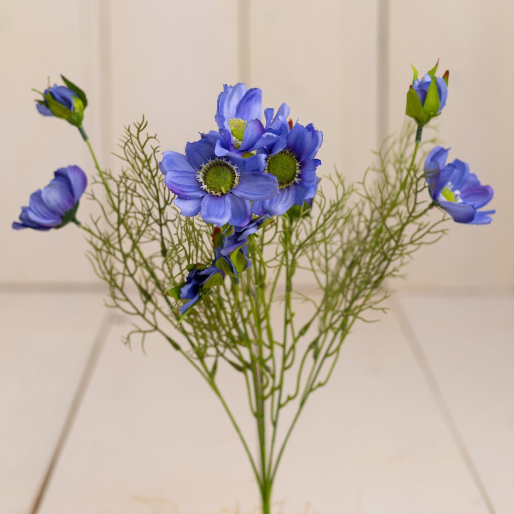 Elegantná kytica kozmosu s výškou približne 40 cm pozostáva z 5 štíhlych stoniek s jemnými modrými kvetmi a ľahkou, vzdušnou zeleňou. Vyznačuje sa prirodzeným lúčnym charakterom a pôsobí veľmi ľahko, sviežo a romanticky.
