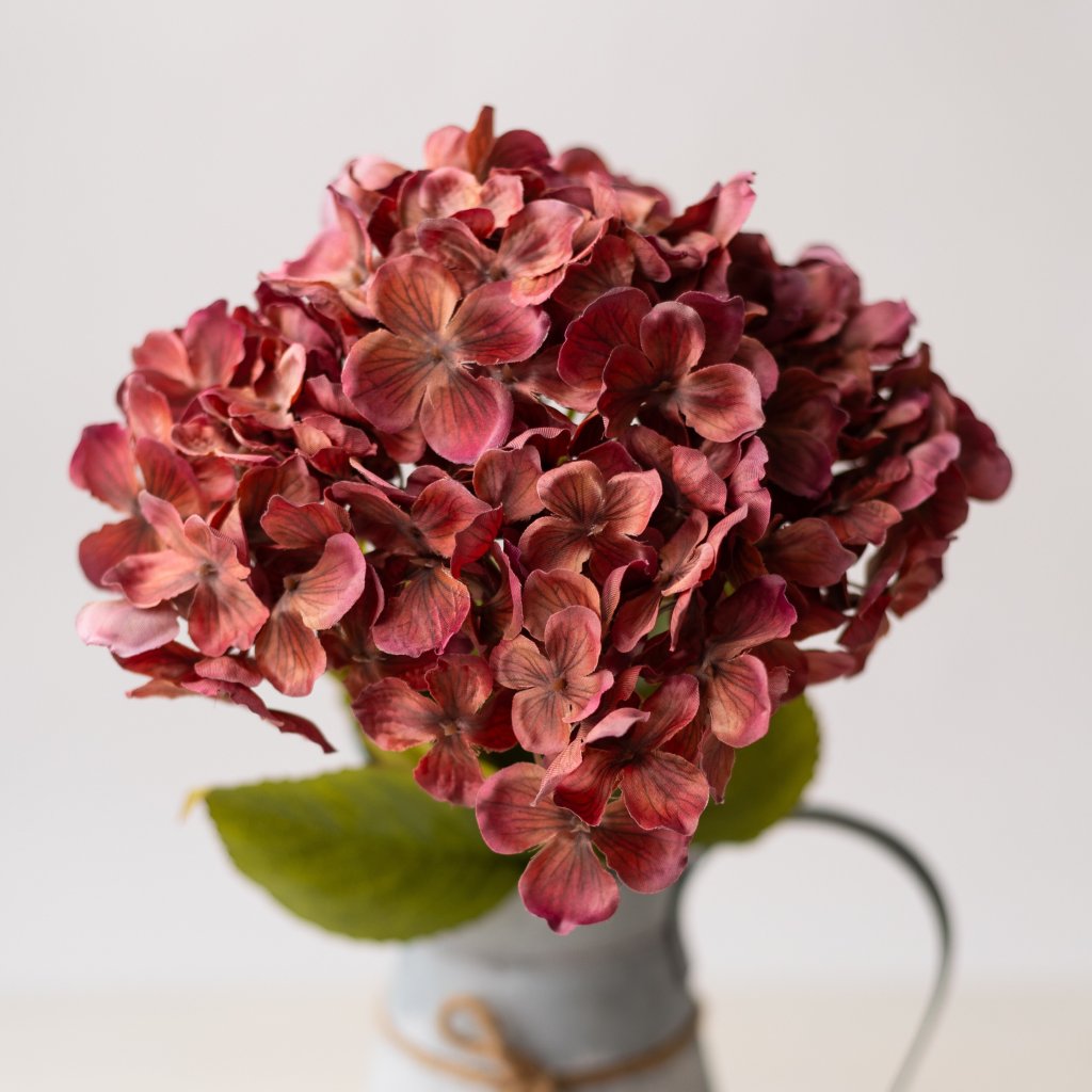 Nádherná kytica Hortenzia ČERVENO HNEDÁ 45cm / 5 stopiek. Výnimočné vykreslenie kvietkov.