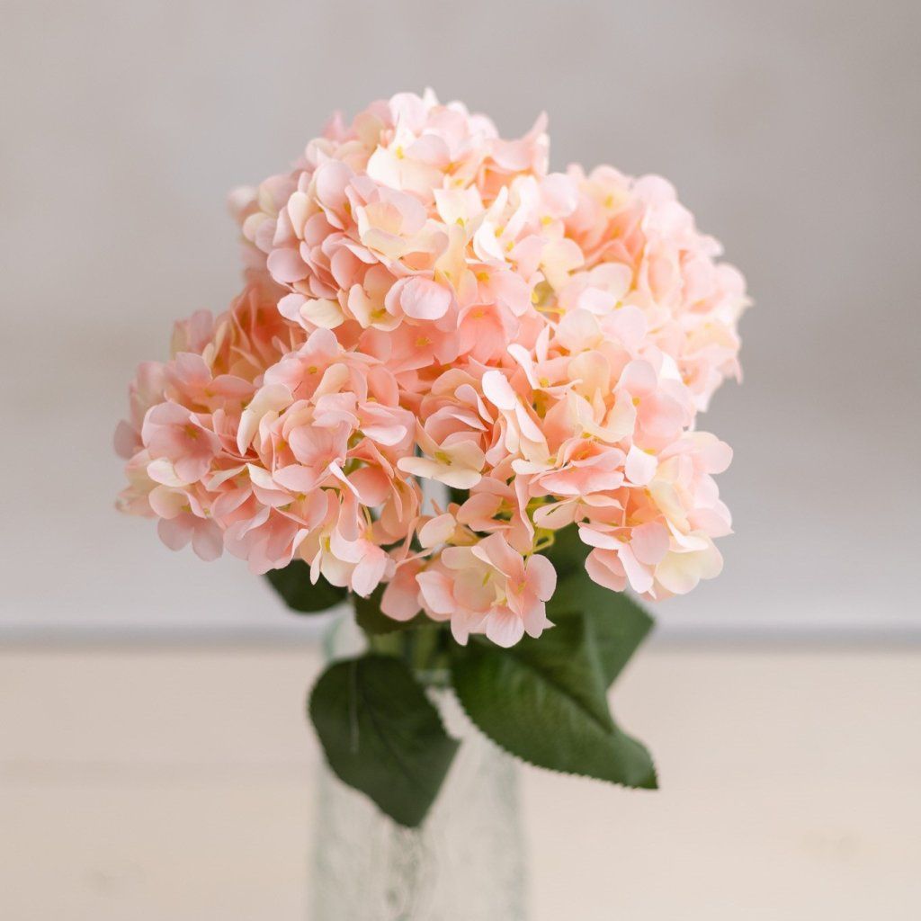 Umelá kytica hortenzie 50 cm s 5 stopkami očarí bohatými, jemnými hlavičkami s priemerom 14-15 cm. Realistické prevedenie a kvalitné spracovanie.