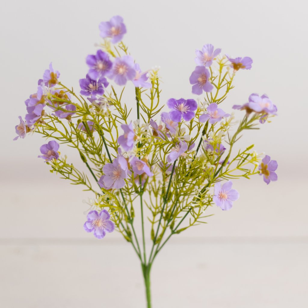 Kytička lúčnych kvietkov s mini kvietkami FIALOVÁ. Umelá kytička s jemnými kvietkami a prízdobami je ideálnou voľbou pre celoročné dekorovanie. Kytička má výšku približne 34 cm a pozostáva zo 6tich rozvetvených stopiek, ktoré vytvárajú prirodzený a vzdušný vzhľad. Vďaka kvalitnému spracovaniu je vhodná na rôzne aranžmány – do váz, kvetinových dekorácií, venčekov, stolových ozdôb či sezónnych výzdob. Je ideálna do domácností, kancelárií, prevádzok aj na slávnostné príležitosti. Umelá kvetinka si zachováva svoj vzhľad počas celého roka a nevyžaduje polievanie ani špeciálnu údržbu.