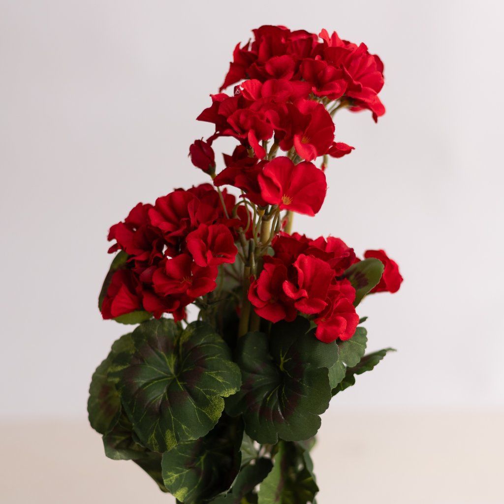 Kvalitné vyhotovenie vysokej kytice Muškát ČERVENÝ 46cm. Kytica má 3 zamatové stonky a 5 stoniek s listami. TOP KVALITA.