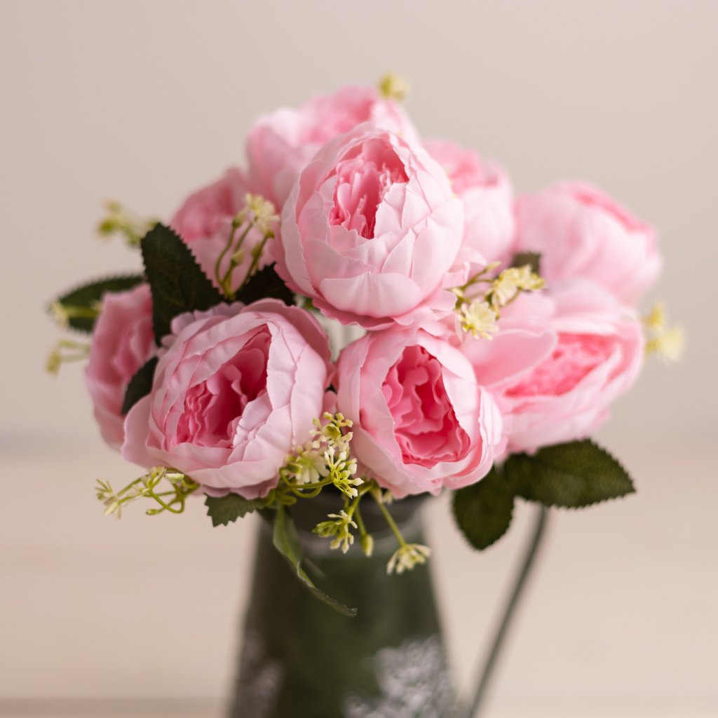 Elegantná kytica pivónií e dokonalou voľbou pre každého, kto hľadá spojenie krásy, kvality a výhodnej ceny. Bohaté hlavičky s detailne tvarovanými lupienkami pôsobia mimoriadne realisticky a dodávajú aranžmánu plnosť a noblesu. Drobné doplnkové kvietky a zelené listy zvýrazňujú prirodzený vzhľad celej kytice.