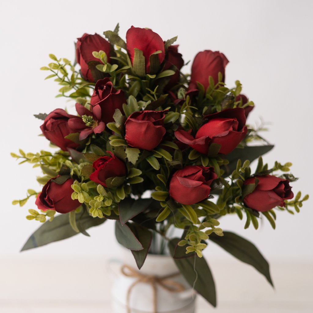 Kytica ruží v puku s lístočkami BORDOVÁ 45cm