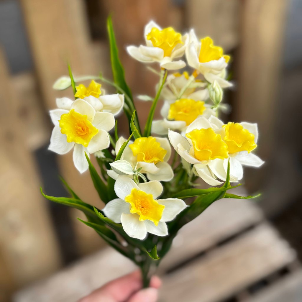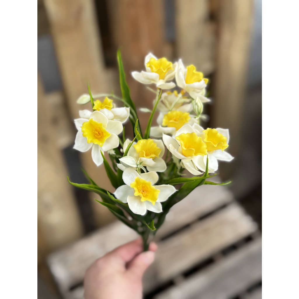 Elegantná gumená kytica narcisiek v sviežich odtieňoch je krásnym symbolom jari, prebúdzania prírody a nových začiatkov. Kvety sú doplnené štíhlymi zelenými listami, ktoré vytvárajú prirodzený a vzdušný vzhľad. S výškou približne 36 cm je kytica ideálna do vázy, na jarné aranžmány, veľkonočné dekorácie, smútočné aranžmány a aj iba tak do interiéru. Narcisky prinesú do priestoru pocit sviežosti, optimizmu a slnečnej atmosféry počas celého roka.