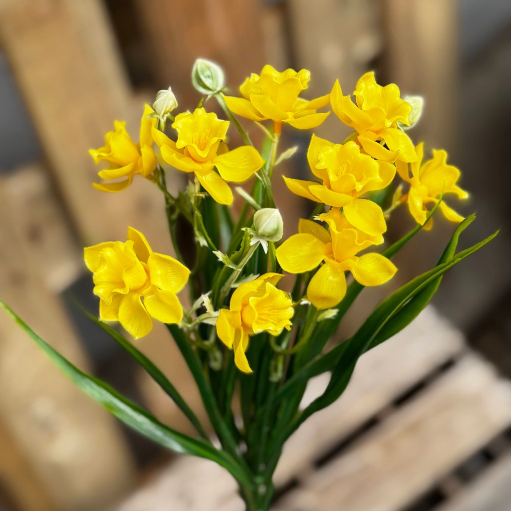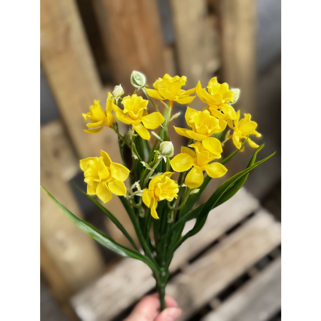 Elegantná gumená kytica narcisiek v sviežich odtieňoch je krásnym symbolom jari, prebúdzania prírody a nových začiatkov. Kvety sú doplnené štíhlymi zelenými listami, ktoré vytvárajú prirodzený a vzdušný vzhľad. S výškou približne 36 cm je kytica ideálna do vázy, na jarné aranžmány, veľkonočné dekorácie, smútočné aranžmány a aj iba tak do interiéru. Narcisky prinesú do priestoru pocit sviežosti, optimizmu a slnečnej atmosféry počas celého roka.