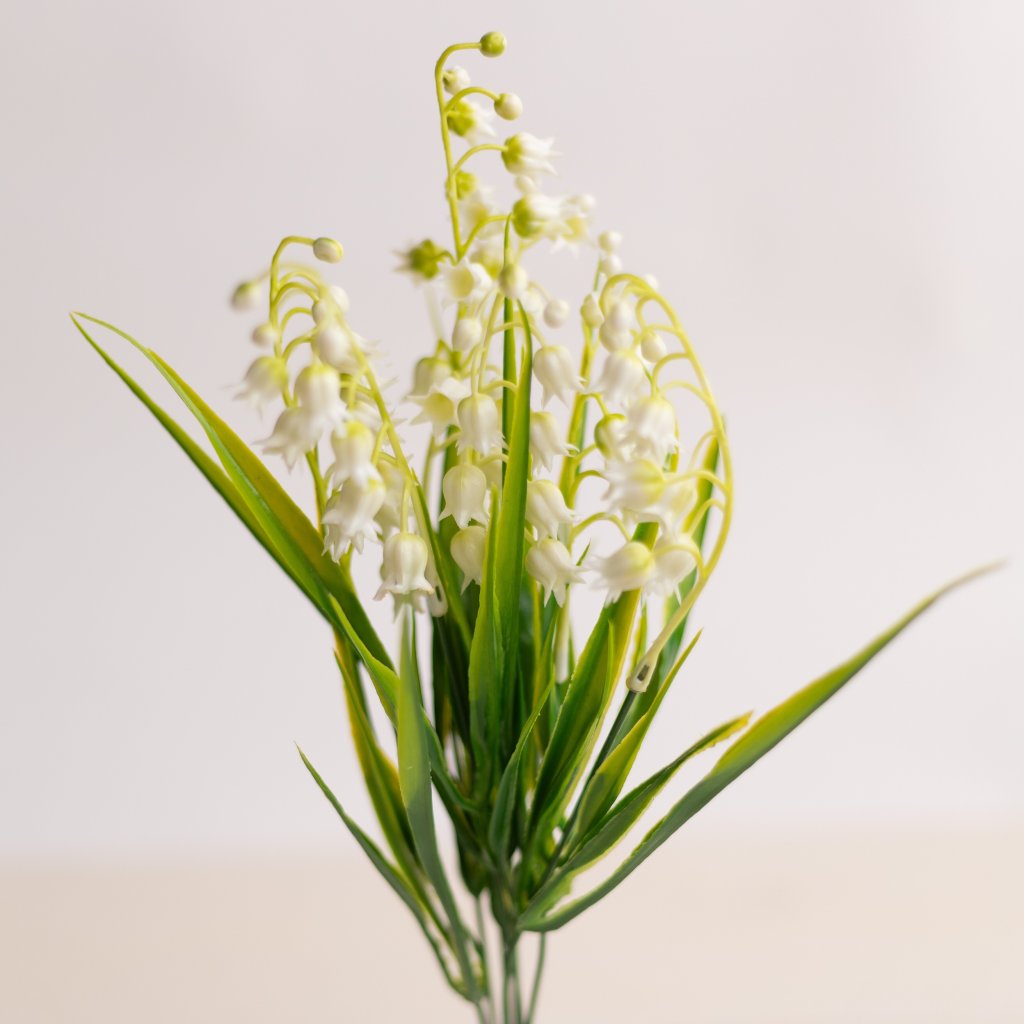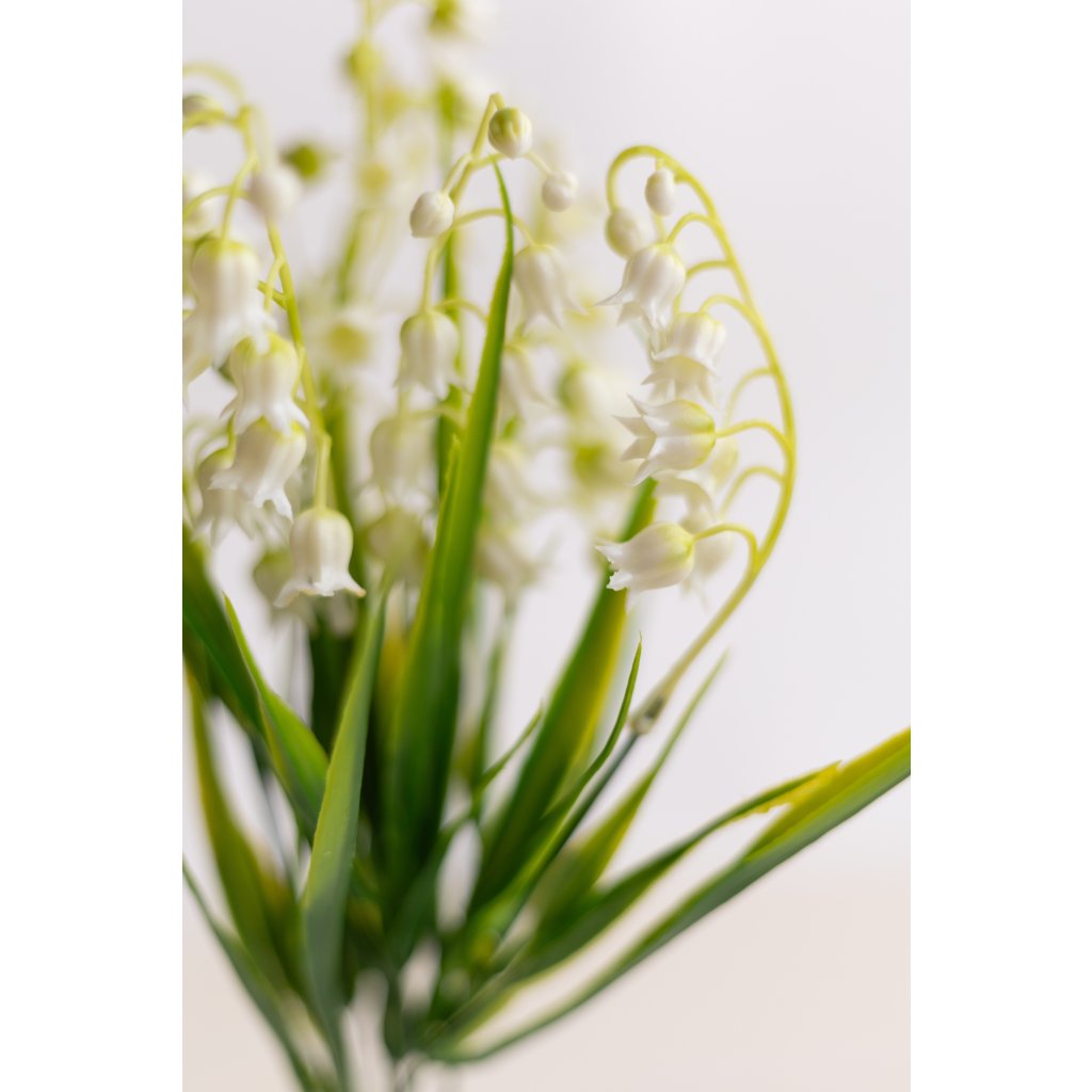 Kytička konvalinky s výškou 35 cm zaujme svojou prirodzenou hustotou a detailným spracovaním. Drobné biele zvončekové kvety sú harmonicky doplnené štíhlymi zelenými listami, pričom jemné poprášenie dodáva aranžmánu realistický, mäkký vzhľad. Kytica pôsobí sviežo a vzdušne, vďaka čomu je ideálna ako jarná dekorácia do vázy, na sviatočný stôl či do výkladov a interiérov ladených v prírodnom alebo romantickom štýle. Nadčasová elegancia konvaliniek prinesie do priestoru pokoj, čistotu a nádych jari.