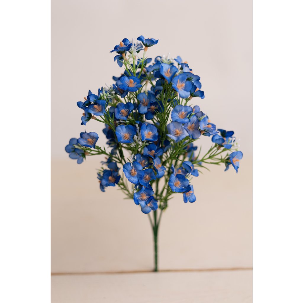 Elegantná modrá umelá kytička s jemnými kvietkami je ideálnou voľbou pre celoročné dekorovanie. Kytička má výšku približne 35 cm a pozostáva z 5 bohato rozvetvených stopiek, ktoré vytvárajú prirodzený a vzdušný vzhľad. Kvety v sýtej modrej farbe s jemným svetlým stredom pôsobia realisticky a vnesú do priestoru sviežosť bez potreby starostlivosti.