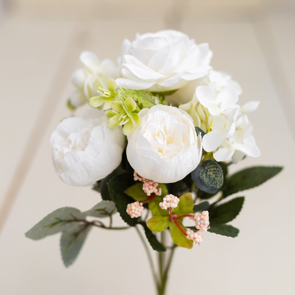 Kvalitná kytička Pivonky, Ruža a Hortenzia BIELA 30cm a 7 stopiek/kvietkov. Šušťavé prevedenie.