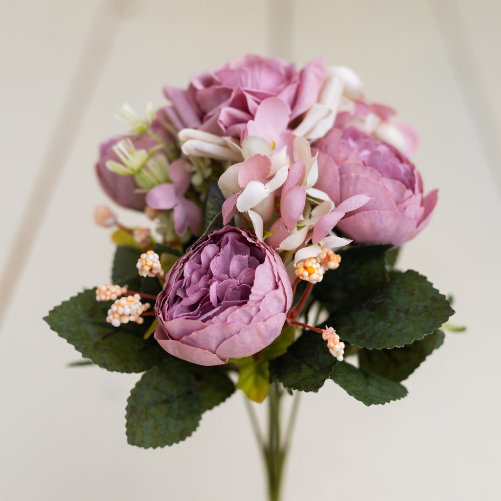 Kvalitná kytička Pivonky, Ruža a Hortenzia FIALOVÁ 30cm a 7 stopiek/kvietkov. Šušťavé prevedenie.