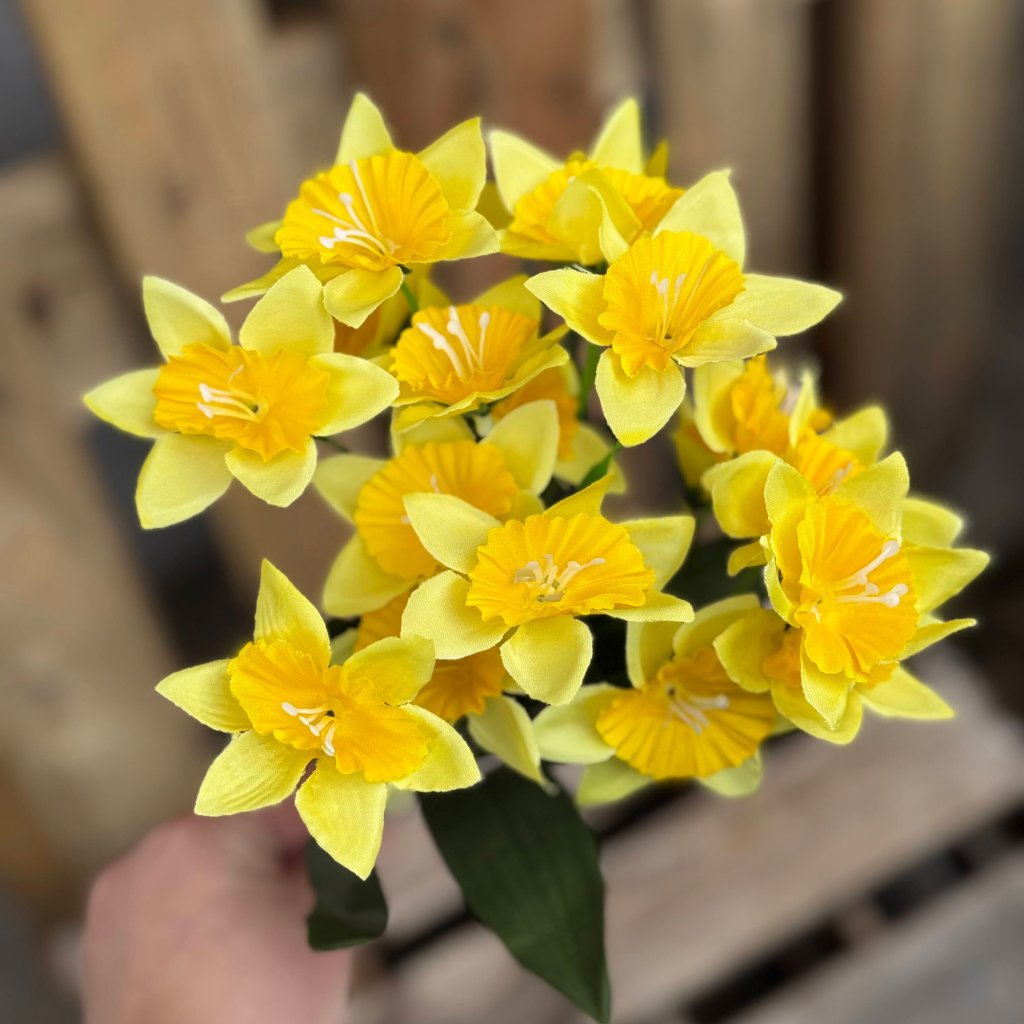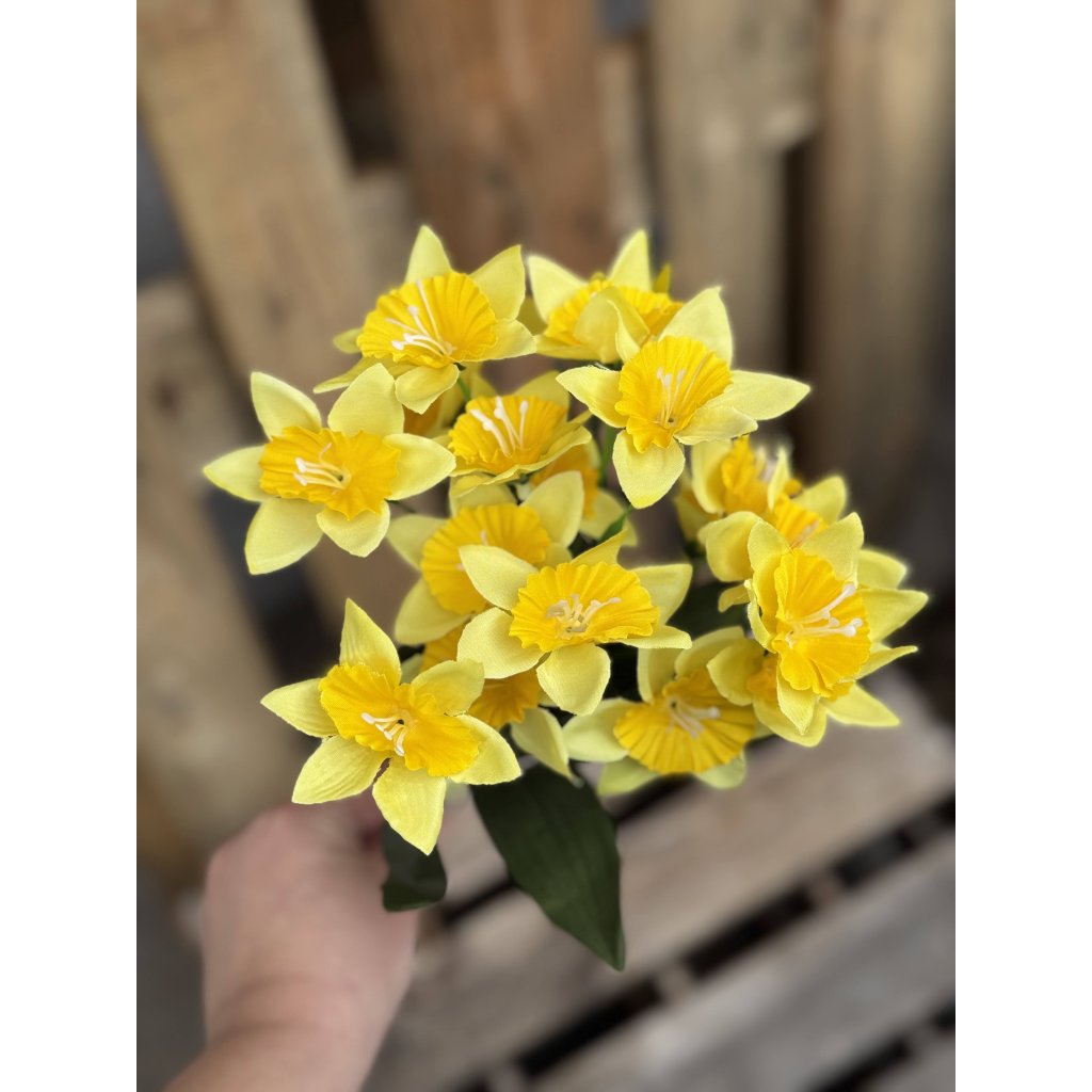 Elegantná kytica narcisiek v sviežich odtieňoch je krásnym symbolom jari, prebúdzania prírody a nových začiatkov. Kvety sú doplnené štíhlymi zelenými listami, ktoré vytvárajú prirodzený a vzdušný vzhľad. S výškou približne 35 cm je kytica ideálna do vázy, na jarné aranžmány, veľkonočné dekorácie, smútočné aranžmány a aj iba tak do interiéru. Narcisky prinesú do priestoru pocit sviežosti, optimizmu a slnečnej atmosféry počas celého roka.
