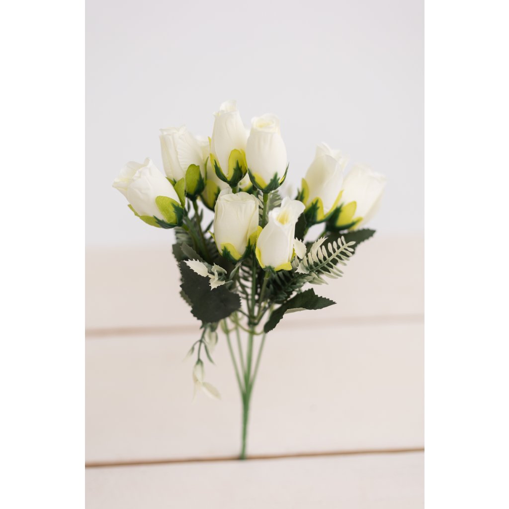 Dekoratívna kytička ružičiek v puku pôsobí jemne, prirodzene a veľmi elegantne. Kombinácia krémových odtieňov spolu so zelenými lístkami vytvára harmonický a nadčasový vzhľad. Kytička má 5 pevných stoniek a spolu 10 detailne spracovaných hlavičiek, vďaka čomu je bohatá a výrazná.