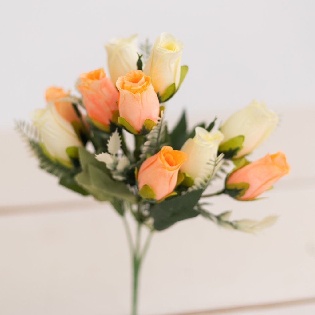 Dekoratívna kytička ružičiek v puku pôsobí jemne, prirodzene a veľmi elegantne. Kombinácia krémových a oranžových odtieňov spolu so zelenými lístkami vytvára harmonický a nadčasový vzhľad. Kytička má 5 pevných stoniek a spolu 10 detailne spracovaných hlavičiek, vďaka čomu je bohatá a výrazná.