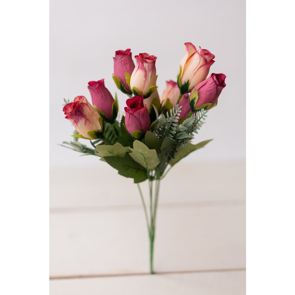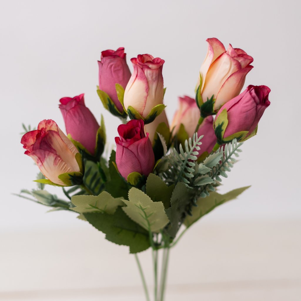 Dekoratívna kytička ružičiek v puku pôsobí jemne, prirodzene a veľmi elegantne. Kombinácia violet odtieňov spolu so zelenými lístkami vytvára harmonický a nadčasový vzhľad. Kytička má 5 pevných stoniek a spolu 10 detailne spracovaných hlavičiek, vďaka čomu je bohatá a výrazná.