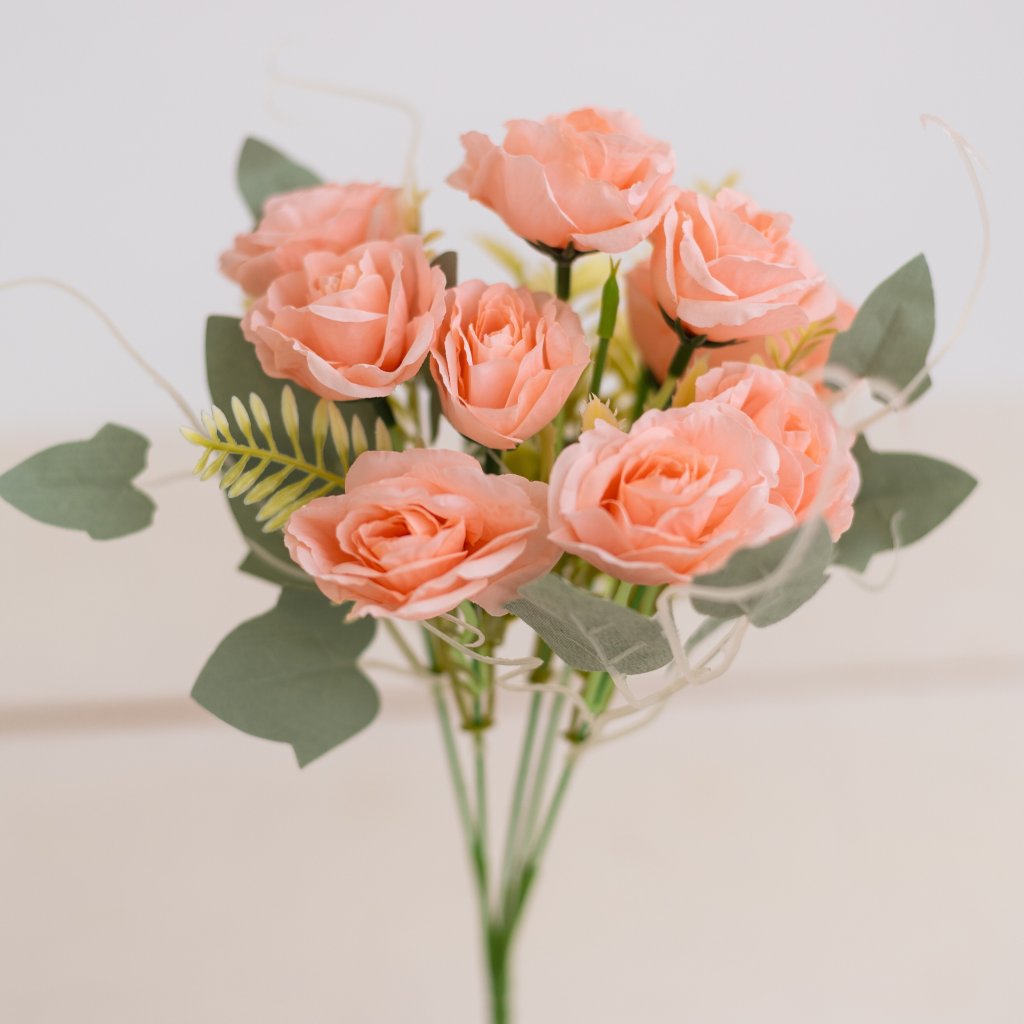 Jemná a elegantná kytička ružičiek s plošejšími hlavičkami je ideálnym doplnkom do celoročných dekorácií. Lososová farba kvetov pôsobí prirodzene a romanticky, sú doplnené zelenými lístkami, ktoré dodávajú aranžmánu svieži a vyvážený vzhľad. Vďaka svojej univerzálnosti je vhodná do vencov, kvetinových aranžmánov, ikebán, dekorácií do interiéru aj na slávnostné príležitosti. Krásne sa kombinuje s inými umelými kvetmi a zeleňou a prinesie do dekorácie jemnosť a eleganciu počas celého roka.