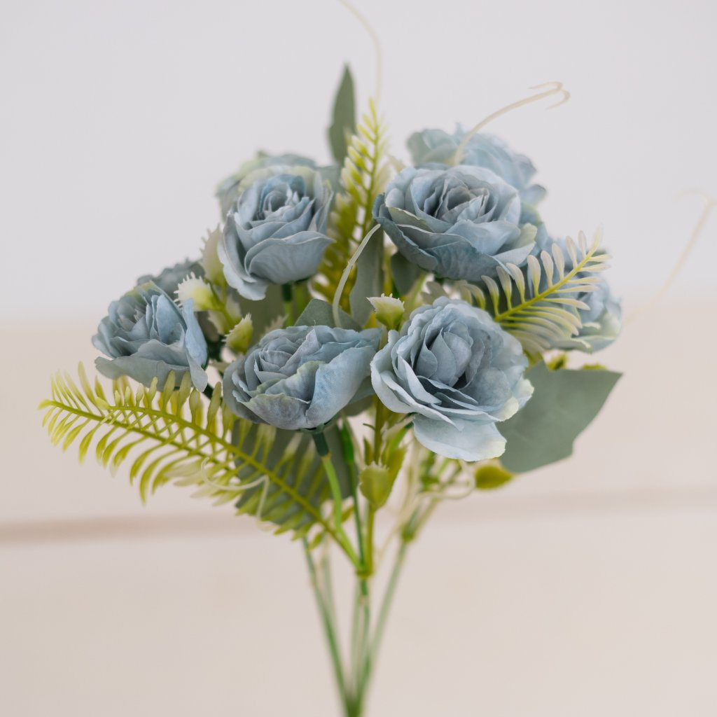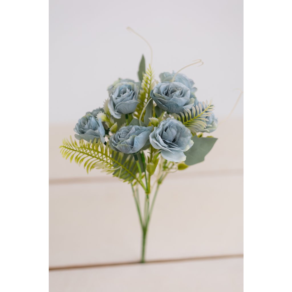 Jemná a elegantná kytička ružičiek s plošejšími hlavičkami je ideálnym doplnkom do celoročných dekorácií. Púdrové modré kvety pôsobia prirodzene a romanticky, sú doplnené zelenými lístkami, ktoré dodávajú aranžmánu svieži a vyvážený vzhľad. Vďaka svojej univerzálnosti je vhodná do vencov, kvetinových aranžmánov, ikebán, dekorácií do interiéru aj na slávnostné príležitosti. Krásne sa kombinuje s inými umelými kvetmi a zeleňou a prinesie do dekorácie jemnosť a eleganciu počas celého roka.