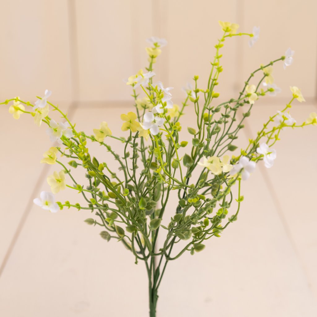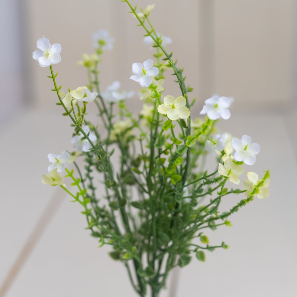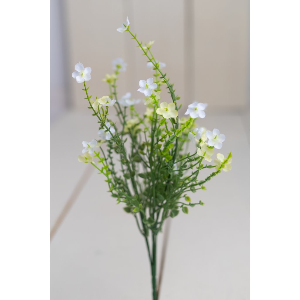 Hustá kytička s množstvom mini kvietkov v jemných bielo-žltých odtieňoch pôsobí prirodzene a elegantne. Drobné kvety sú rovnomerne rozmiestnené na tenkých zelených stonkách, vďaka čomu vytvára bohatý a vzdušný vzhľad. Celková výška 38 cm je ideálna do váz, aranžmánov alebo ako doplnok k väčším kvetinovým dekoráciám. Kytička sa hodí do moderných aj rustikálnych interiérov, kde dodá pocit sviežosti, ľahkosti a prírodnej harmónie.