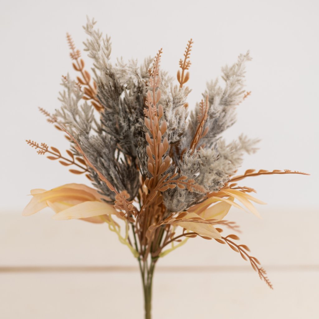 Kytička púdrová prízdoba s hnedými listami ŠEDÁ 35cm. Zaujímavé prevedenie.