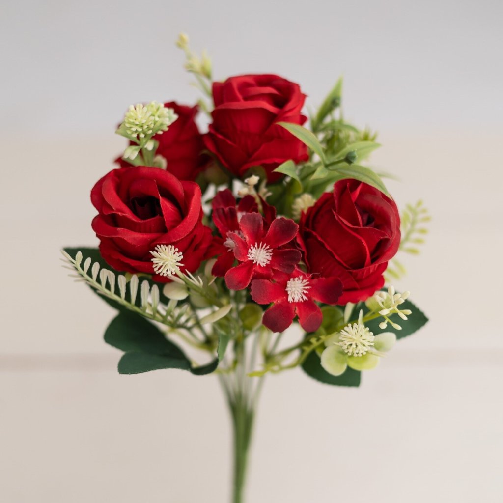 Červená kytička ruža s prízdobou 32cm, 6 stopiek.