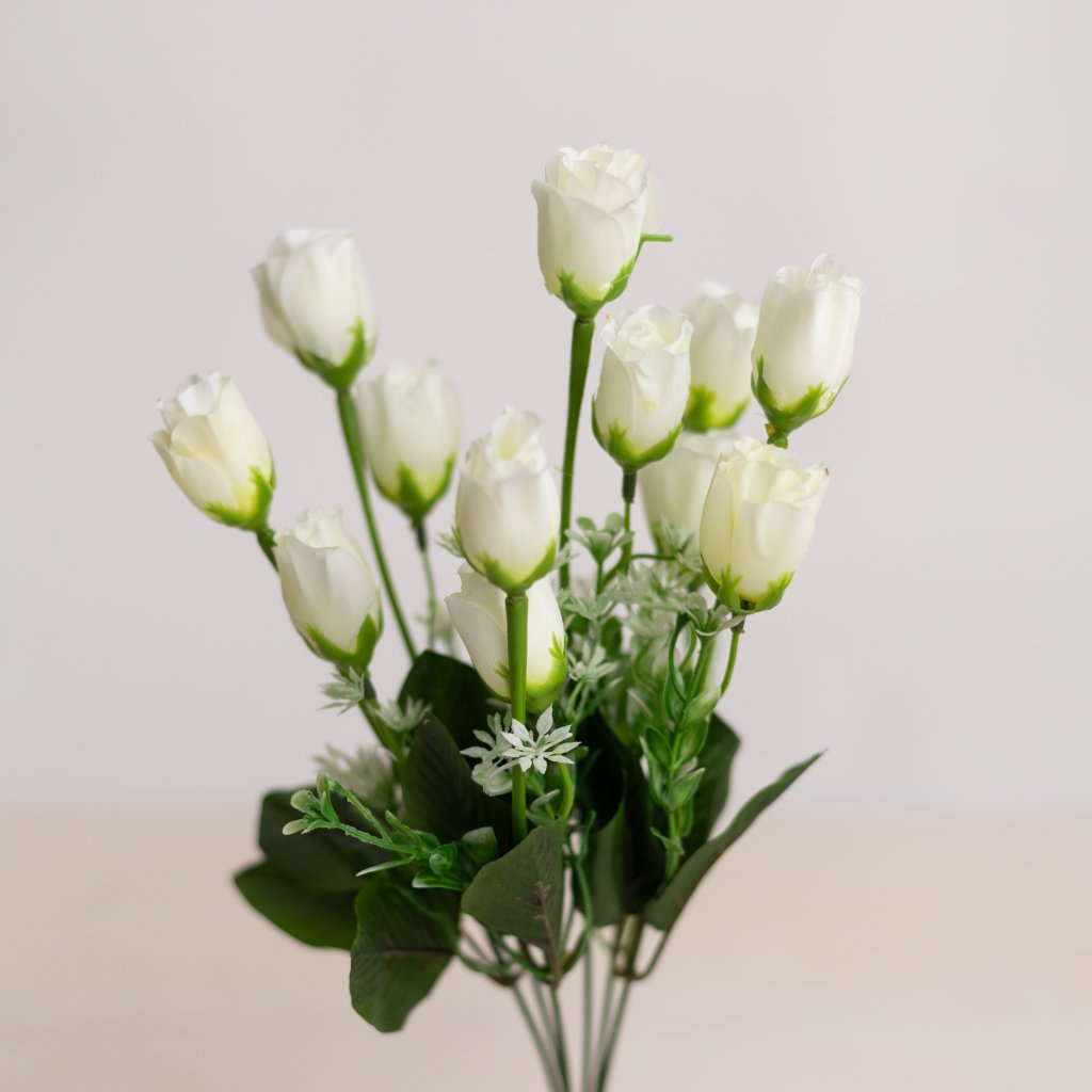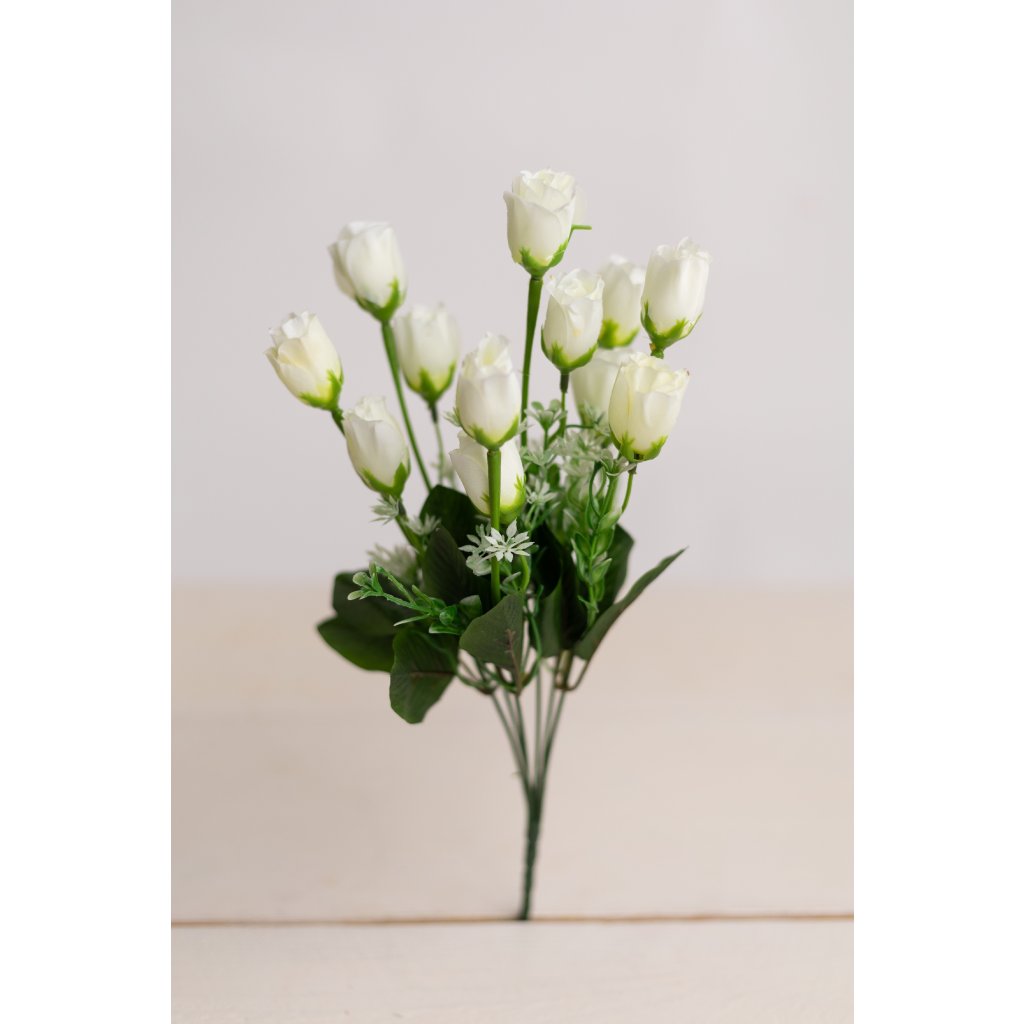 Dekoratívna kytička ružičiek v puku pôsobí jemne, prirodzene a veľmi elegantne. Vhodná je na celoročné dekorácie, aranžmány, vence, ikebany, bytové aj svadobné dekorácie. Krásne sa kombinuje s inými umelými kvetmi alebo zeleňou a dodá každému priestoru romantický a upravený vzhľad.