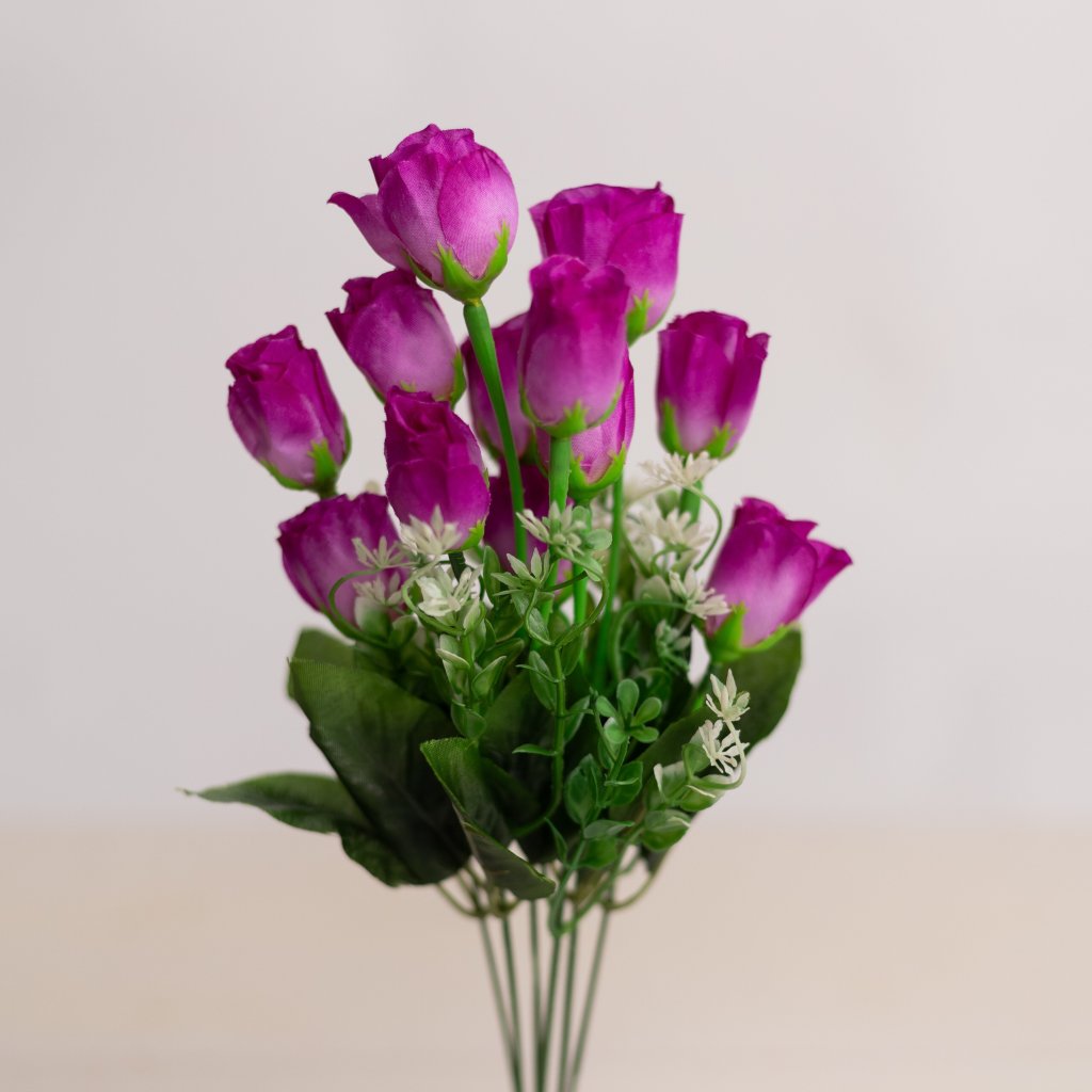 Dekoratívna kytička ružičiek v puku pôsobí jemne, prirodzene a veľmi elegantne. Vhodná je na celoročné dekorácie, aranžmány, vence, ikebany, bytové aj svadobné dekorácie. Krásne sa kombinuje s inými umelými kvetmi alebo zeleňou a dodá každému priestoru romantický a upravený vzhľad.