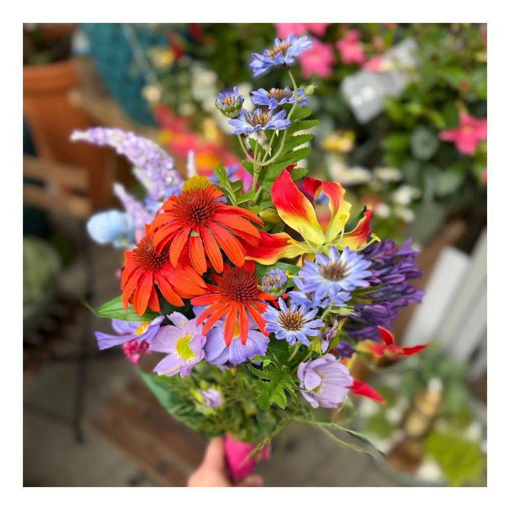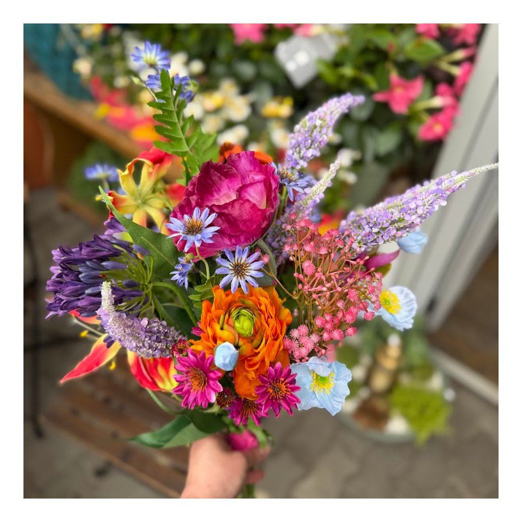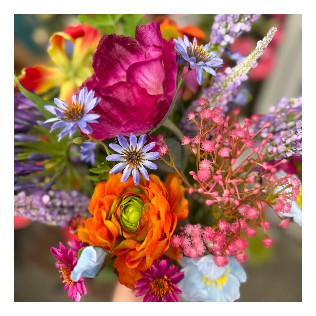 Lúčna kytica vo fialovo, oranžovo cyklamenových farbách, plná kvalitných umelých kvietkov rôzneho druhu. Výška kytice 50cm.