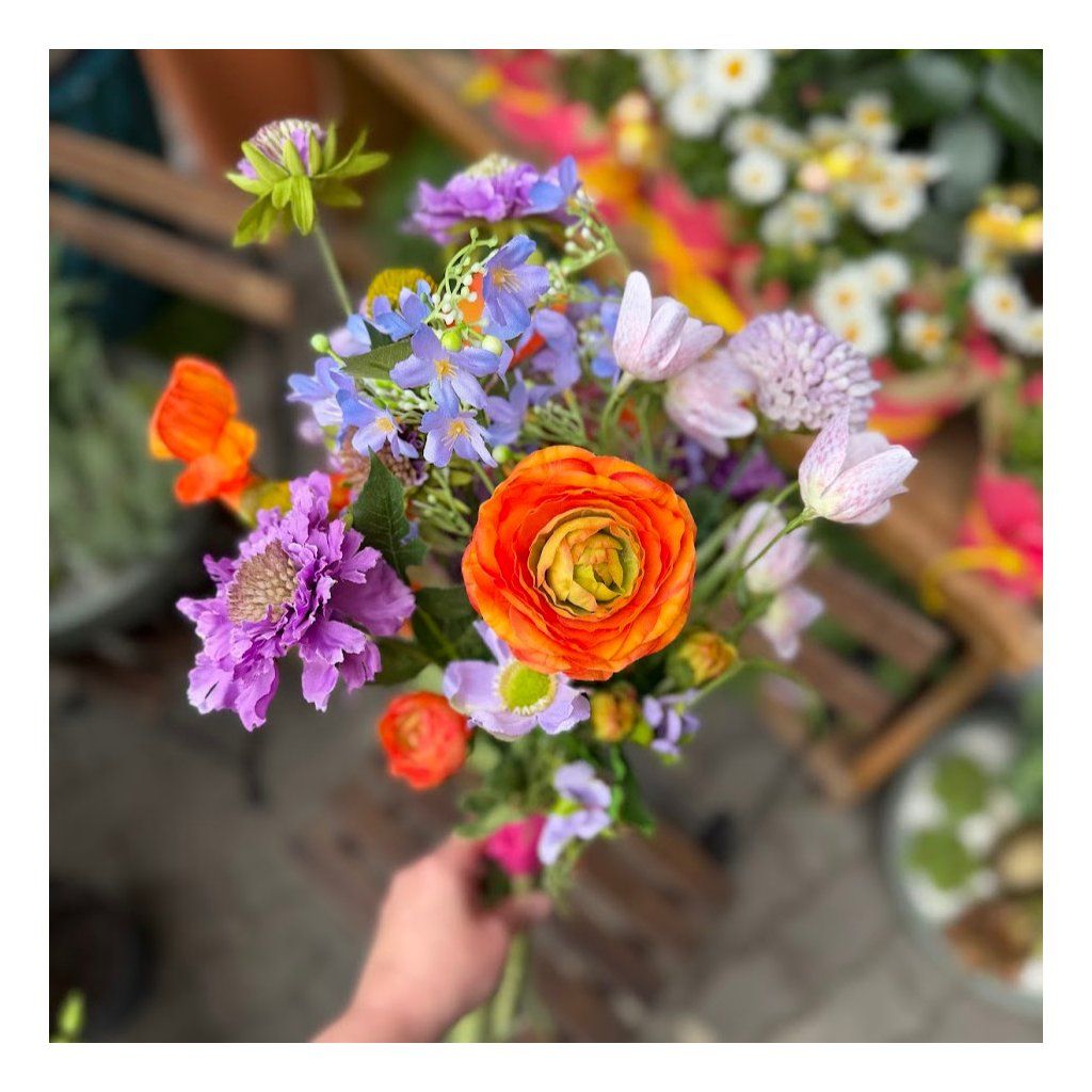 Lúčna kytica vo fialovo oranžových farbách, plná kvalitných umelých kvietkov rôzneho druhu. Výška kytice 50cm.