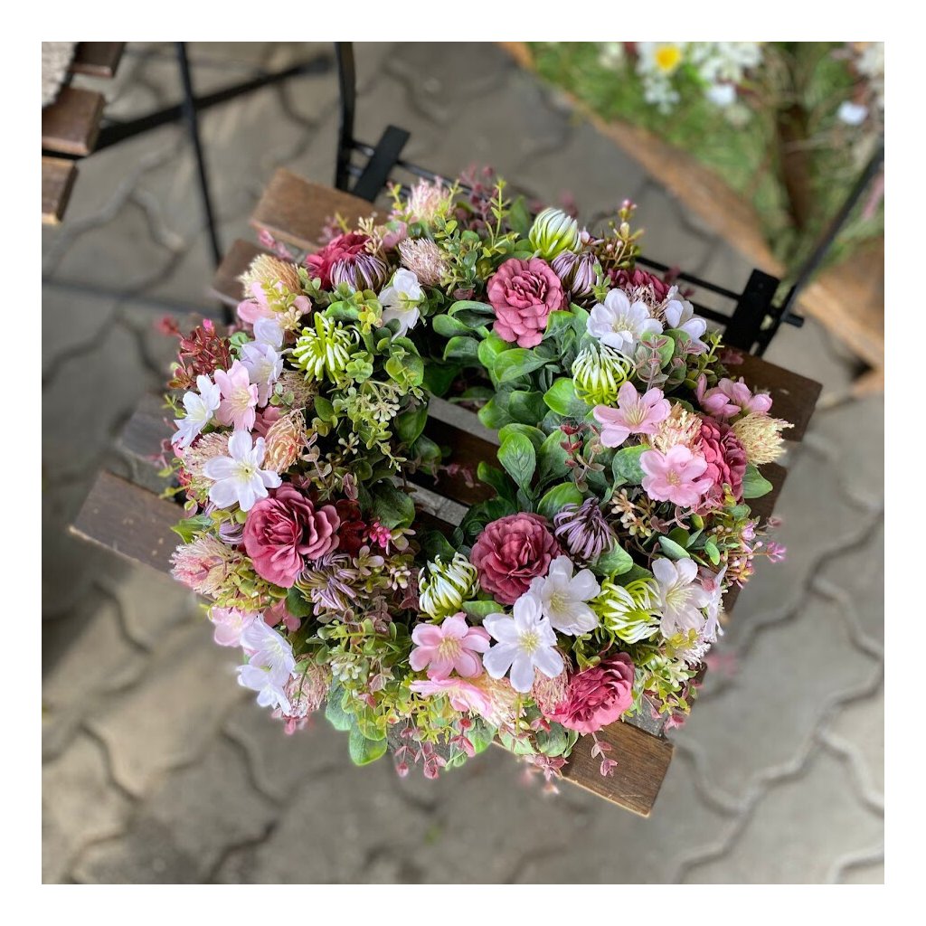 Lúčny venček zemité farby s priemerom 35cm. Použitý je kvalitný materiál.