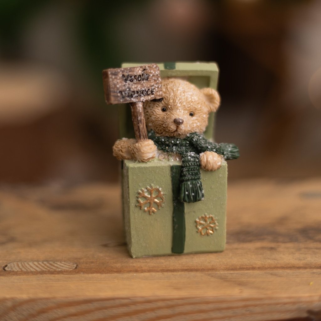 Vianočná postavička Medvedík v zelenej krabičke s nápisom Veselé Vianoce 9 x 6 cm. Polyresin.