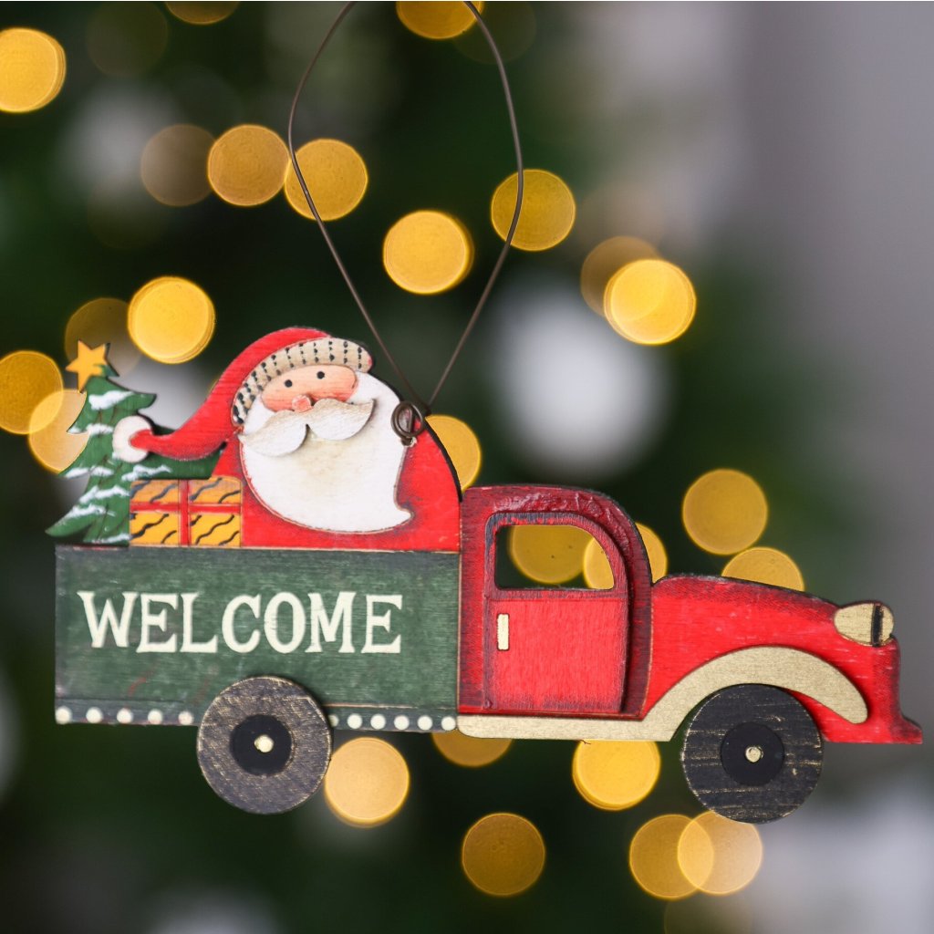 Červená drevená ozdoba auto s Mikulášom 14x9cm.