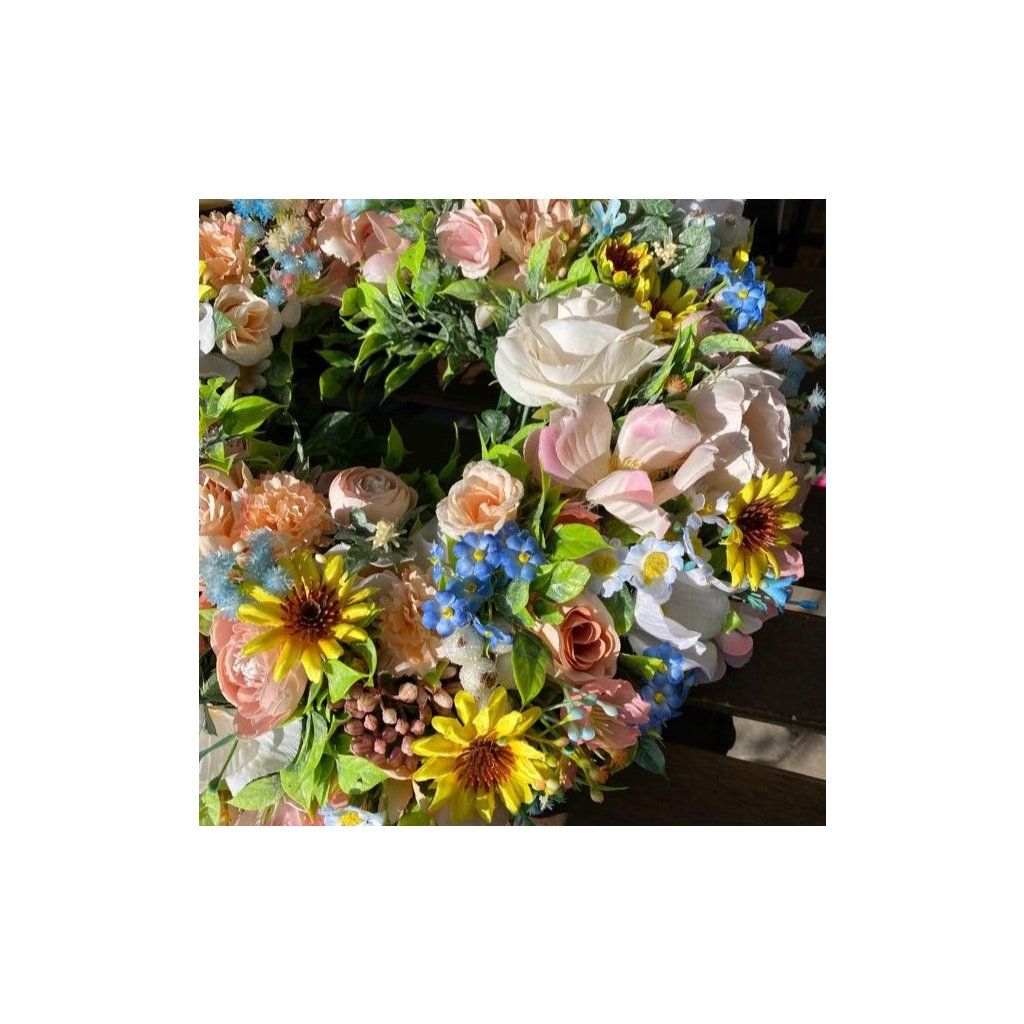 Jemný pastelový venček cca 38cm, husto zdobený kvalitnými kvietkami a detailom s krásnou modrou nezábudkou. Použitý je kvalitný materiál.