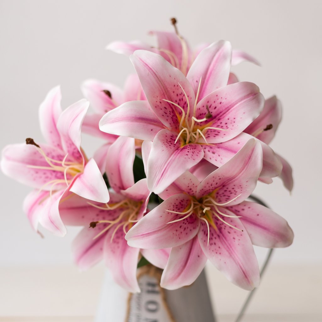 Pogumovaná kytica Ľalia FIALOVO RUŽOVÁ s piestikmi 45cm. Pogumované kvietky zaručujú kvalitu a nevyblednutie na slnku pri použití v smútočných aranžmánoch.